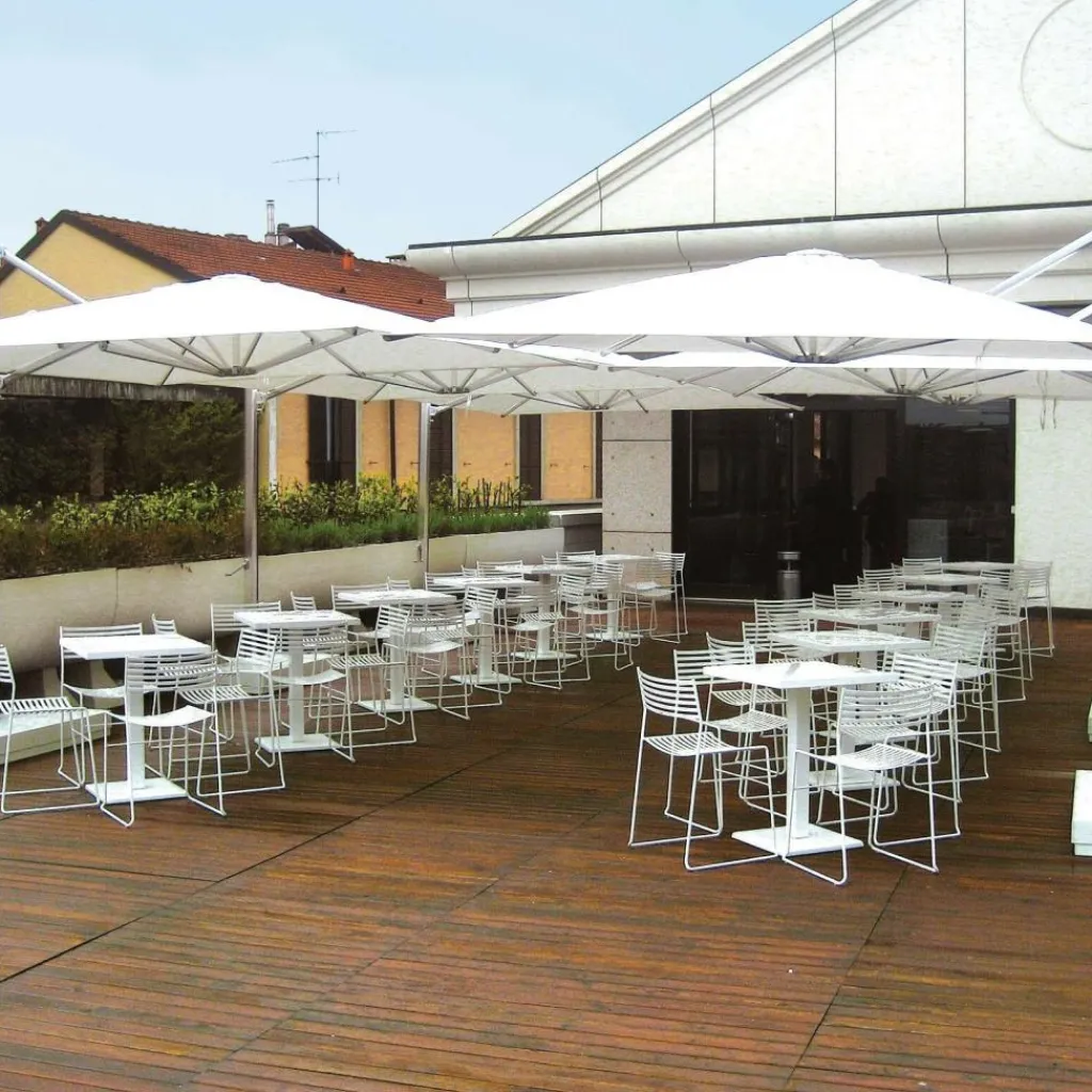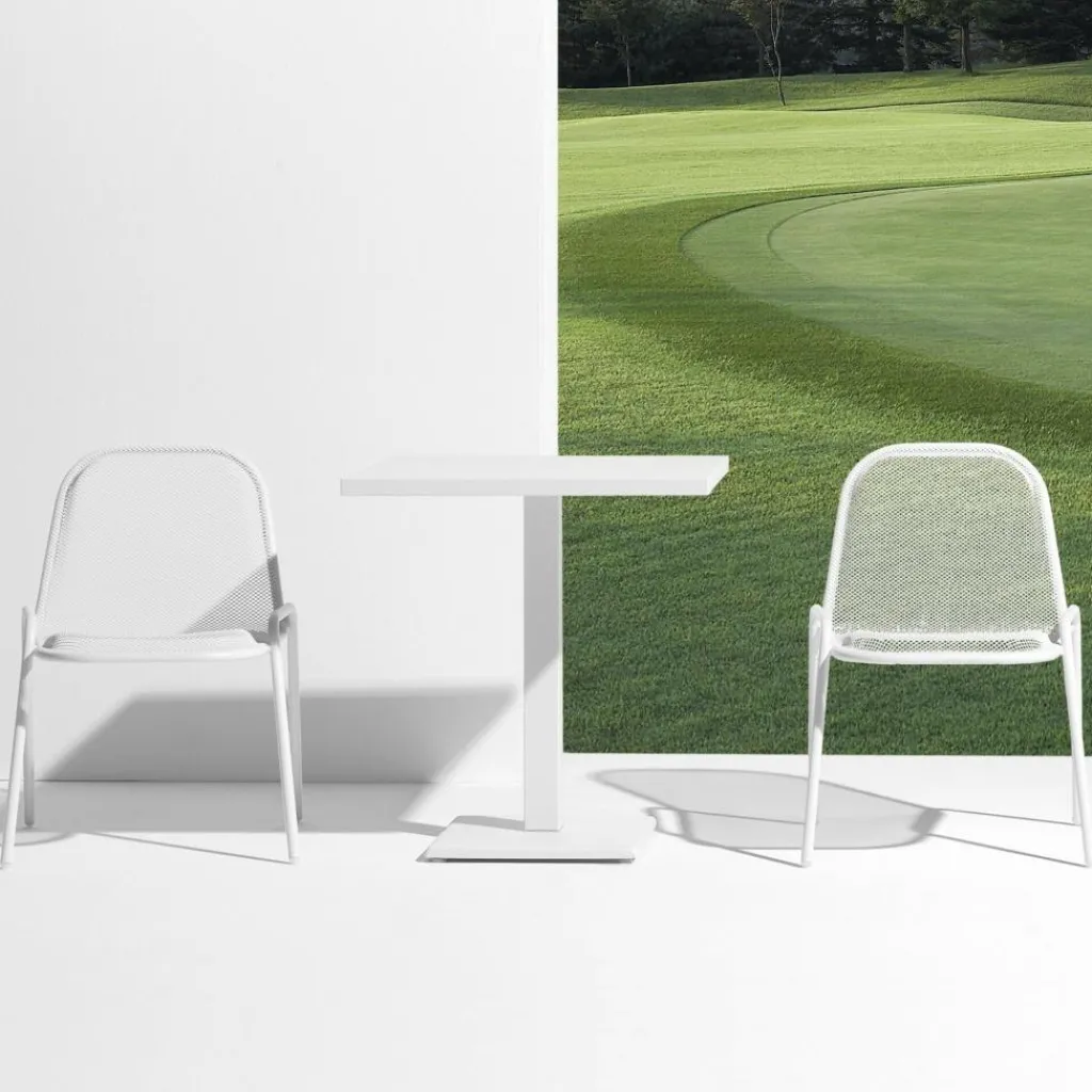 Während der Designer bei den Stühlen der Kollektion runde Formen bevorzugt, entscheidet er sich beim Round Gartentisch 70x70x75cm bewusst für Kanten. Sowohl die Basis als auch die Tischplatte bilden ein Quadrat. Die beiden Elemente verbindet ein eckiger Fuß. Da sich der Entwurf auf die wesentlichen Elemente beschränkt, ist der Round Gartentisch 70x70x75cm vielseitig einsetzbar. Er ist auf dem Balkon oder auf der Terrasse ein beliebter Treffpunkt, eignet sich jedoch auch für den Außenbereich von Cafés und Restaurants. Für größere Runden können mehrere Tische aneinandergeschoben werden. Der Round Gartentisch 70x70x75cm besteht aus pulverbeschichtetem Stahl. Es gibt ihn in verschiedenen Farben. Der robuste und witterungsbeständige Tisch kann bei jedem Wetter im Freien bleiben. Wird er einmal nass, kann die Oberfläche mit einem weichen Tuch abgewischt werden.