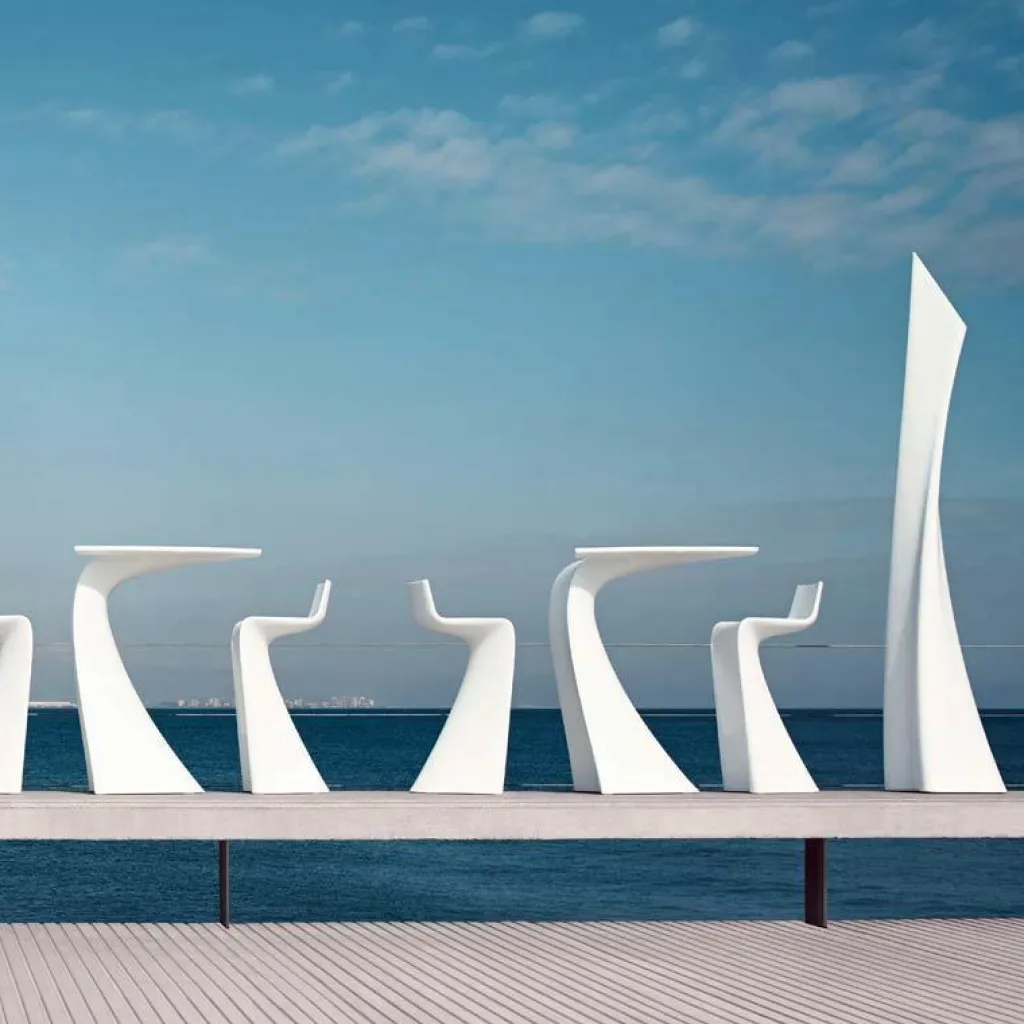 Zu den Extras des Wing Bartisches zählt dabei vor allem seine mutige, unkonventionelle Wellenform. Außerdem setzt er mit seinen glatten Flächen, der hohen Kunststoffqualität und der Vielseitigkeit in jedem Barbereich Akzente. Dabei fügt er sich sowohl in schlichte als auch in bunt eingerichtete Ambientes ein. Dafür sind nicht zuletzt die Größenverhältnisse verantwortlich, für die Studio A-cero sich entschieden hat. Der Wing Bartisch misst 56 x 100 x 76 cm. Weitere stylische Extras, durch die sich der Wing Bartisch von der Masse abhebt, sind sein geringes Gewicht und seine Pflegeleichtigkeit. Hier bekommen Sie ein Design geboten, das Ihren Lounge-Bereich mit einem ganz neuen Stilgefühl vollendet.