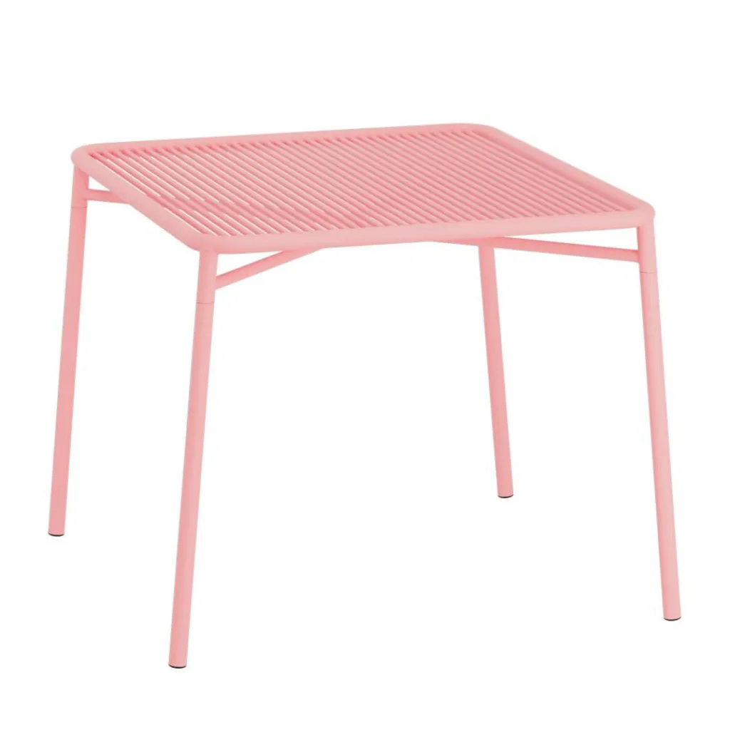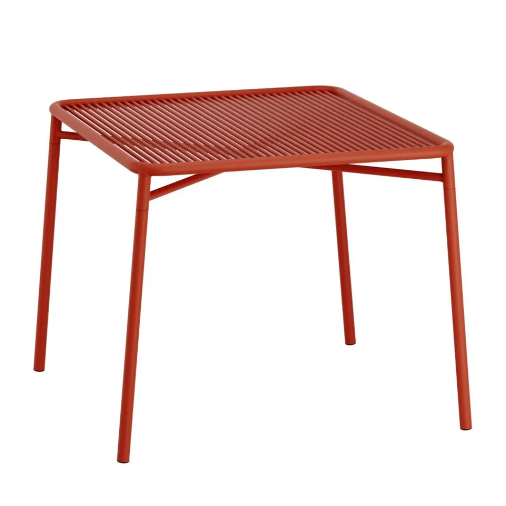 Eine Reihe von schlanken Metallstäben bildet die Tischfläche dieses formschönen Outdoormöbels, das dank seiner peppigen Farbe einen auffälligen Kontrast ins Ambiente zaubert. Der Abstand der Stabelemente ist so gering gehalten, dass abgelegte Dinge nicht durch die Zwischenräume gleiten können. Gleichzeitig ermöglicht die Fläche den Durchblick auf den Untergrund. Im Sonnenlicht beeindruckt der Ivy Gartenesstisch 90x90cm darüber hinaus mit einem eindrucksvollen Schattenwurf. Der Tischrahmen besteht aus robustem Rundstahl. Dabei sind die Beine leicht ausgestellt und kreuzweise verstrebt. Damit zeichnet sich der Ivy Gartenesstisch 90x90cm durch eine stabile Belastbarkeit aus. Seiner pulverbeschichteten Oberfläche verdankt er eine hohe Witterungsbeständigkeit. Er eignet sich für eine Terrasse und kann auch mitten in der Wiese stehen – in einem Atrium-Restaurant, Hotelgarten oder im privaten Grün.