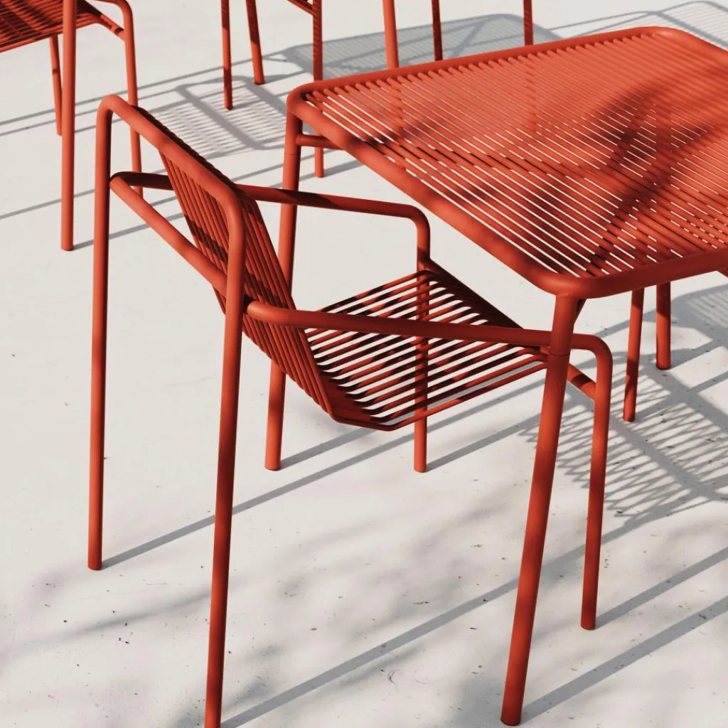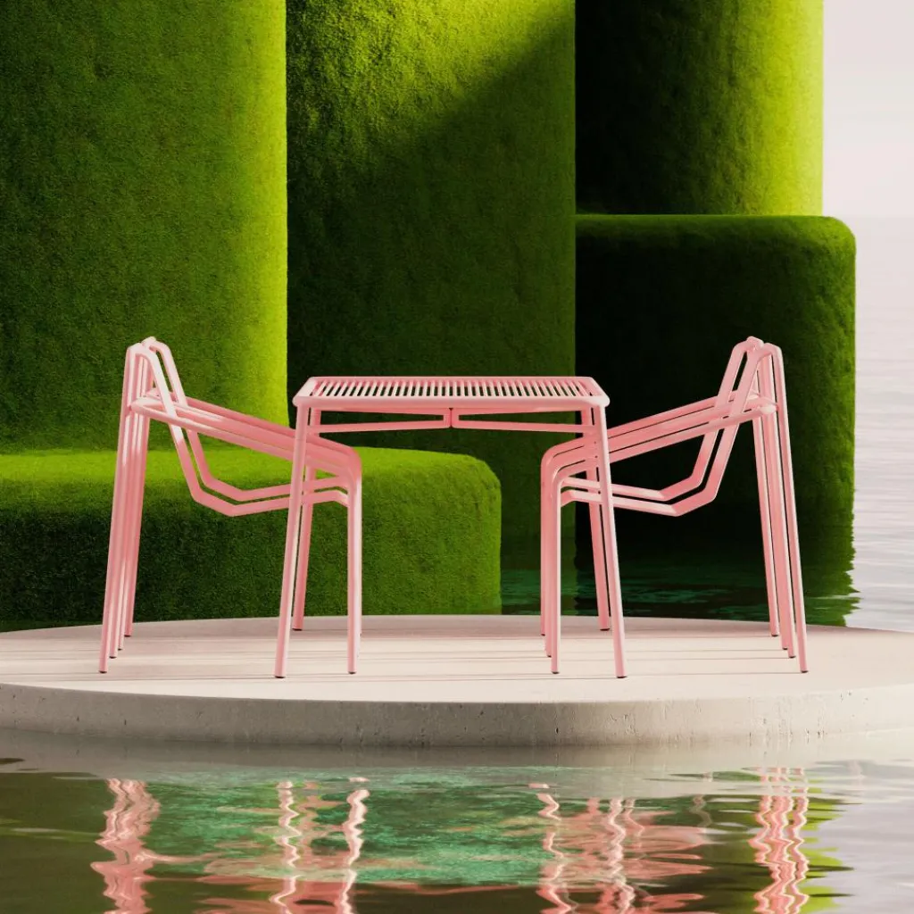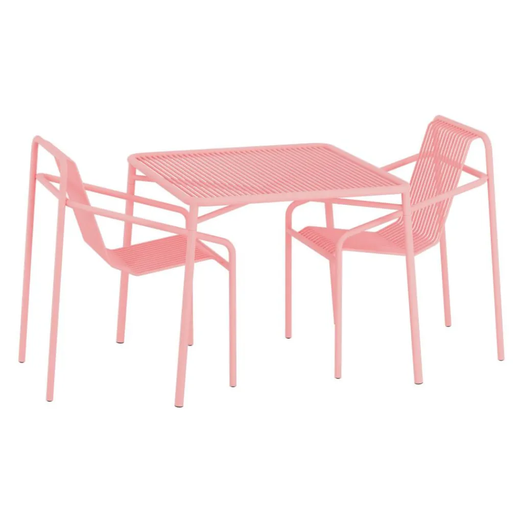 Während die konstruktiven Rahmen dieses Ensembles von einem robusten Charakter geprägt sind, beeindrucken die flächigen Elemente von Tisch und Stühlen mit einer Transparenz, die eine verspielte Leichtigkeit versprüht. Sie setzen sich zusammen aus auf Lücke gesetzten Stabreihen, die den Untergrund durchscheinen lassen und im Sonnenlicht zudem interessante Schatten erzeugen. Gefertigt aus Stahl, verschweißt und mit einer Pulverbeschichtung versehen, zeichnet sich das Ivy Gartenset Tisch 90cm + 2 Armlehnstühle durch seine witterungsbeständige Robustheit aus. Es ist für den Einsatz unter freiem Himmel geeignet und passt in ein Straßencafé, auf eine Hotelterrasse sowie in den privaten Garten.