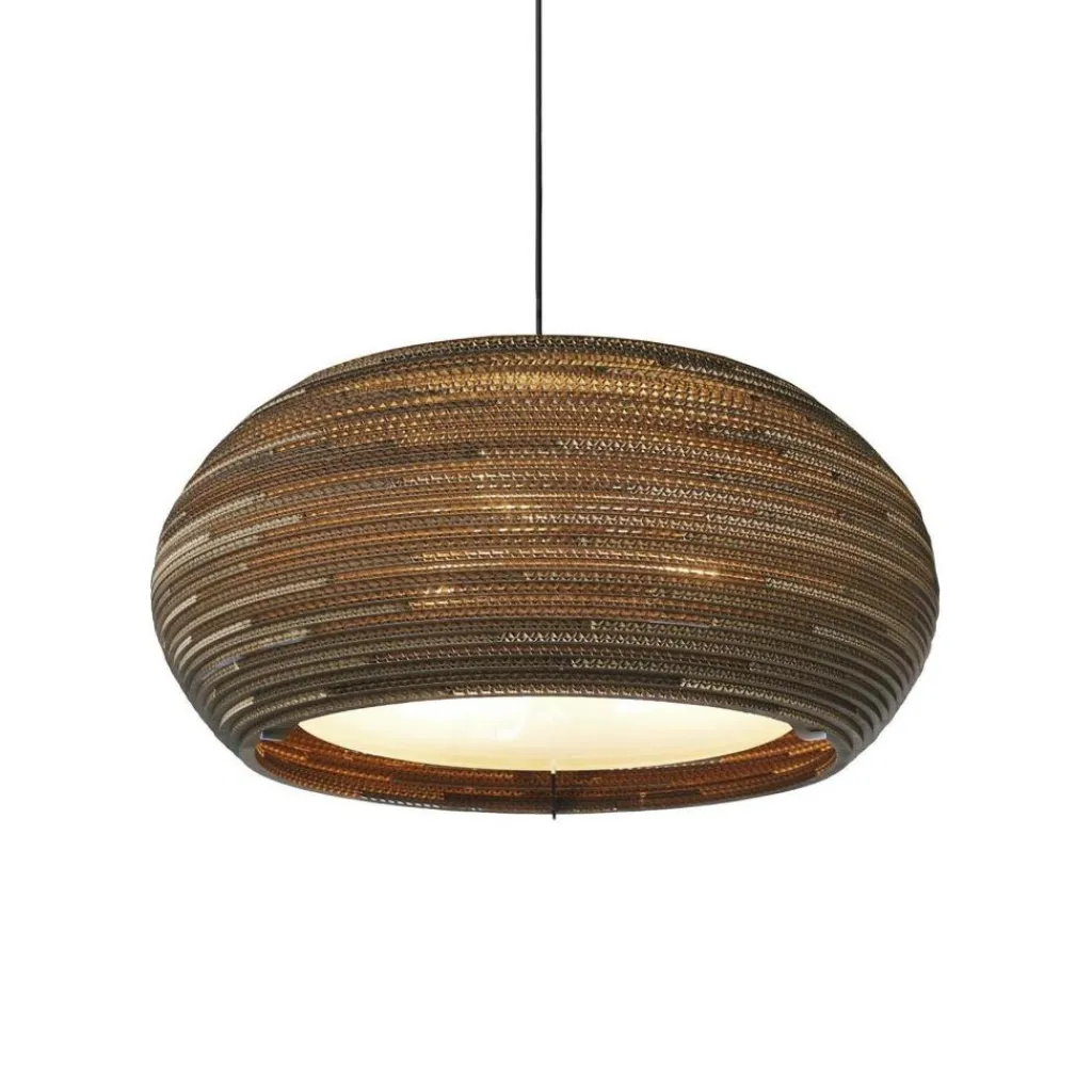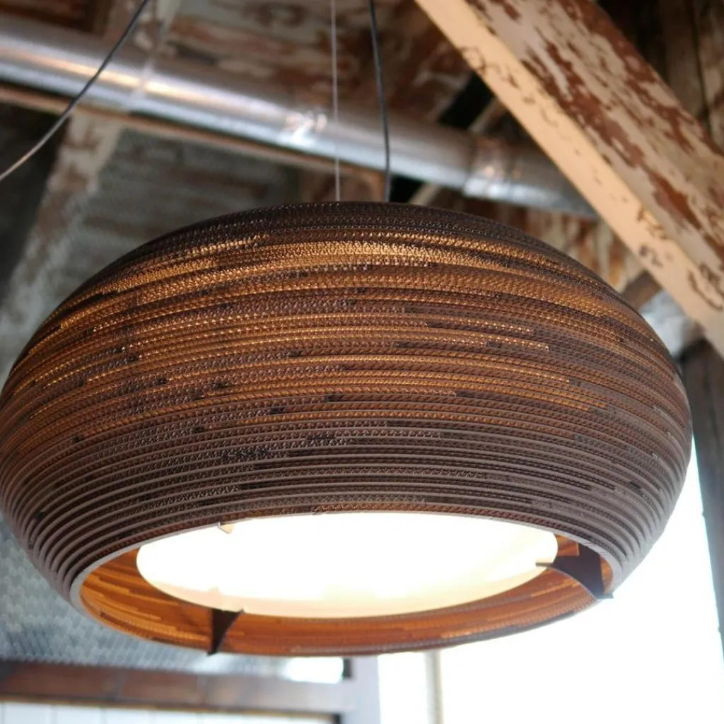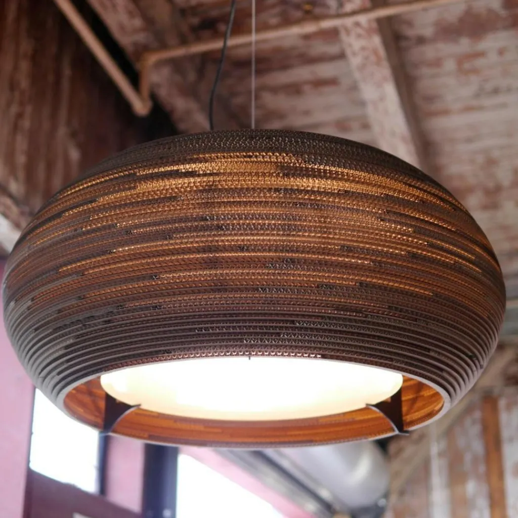Wer die Ohio Pendelleuchte betrachtet, kommt nicht auf die Idee, dass es sich dabei um ein Recyclingprodukt handelt. Der Leuchtenschirm besteht aus altem Karton und wird von einem Stahlrahmen gehalten. Durch eine spezielle Technik entsteht der fein gerillte Schirm, durch den atmosphärisches Licht dringt. Das Modell passt in jedes Wohn-, Schlaf- oder Esszimmer. Auch in der Gastronomie und der Hotellerie wird es zum Blickfang.