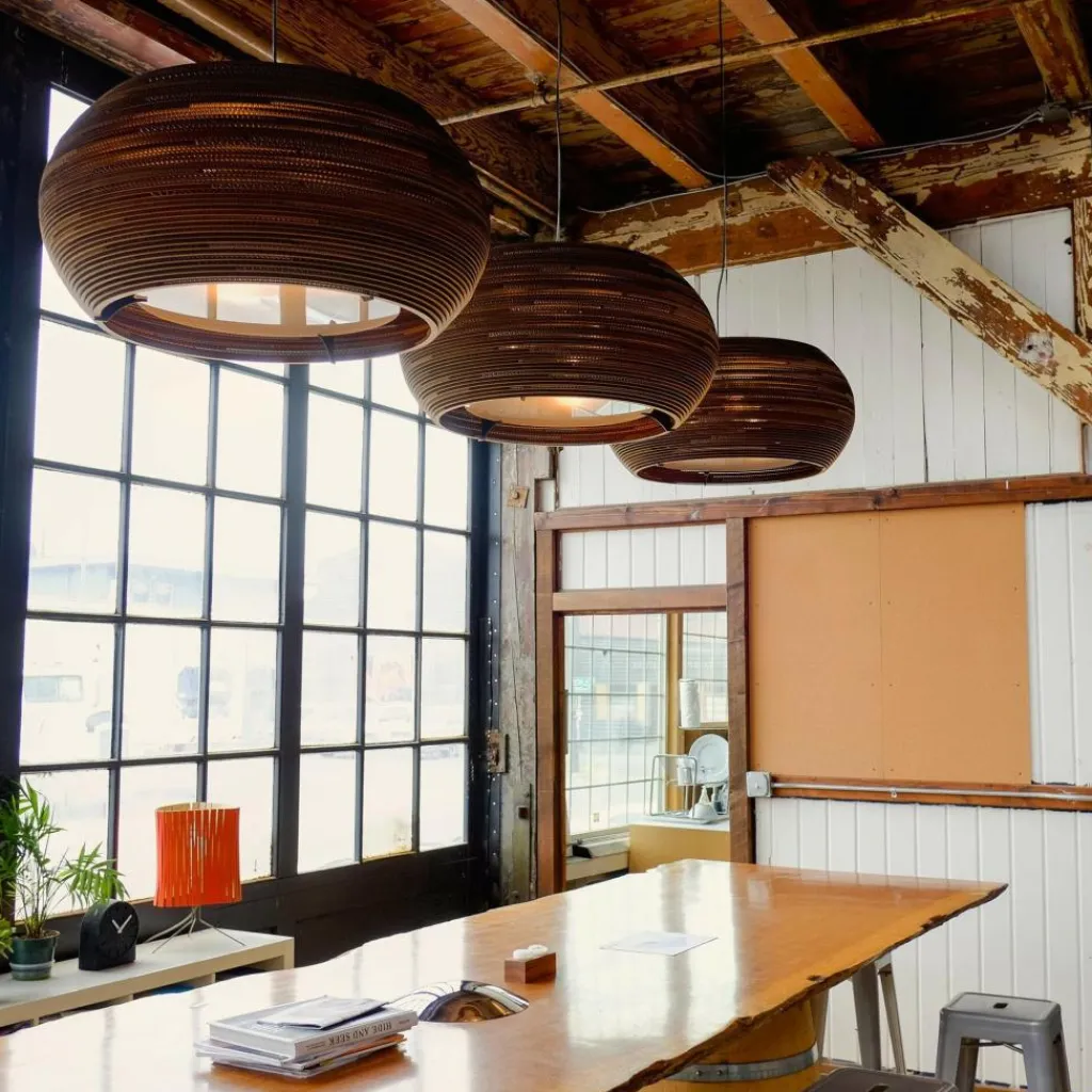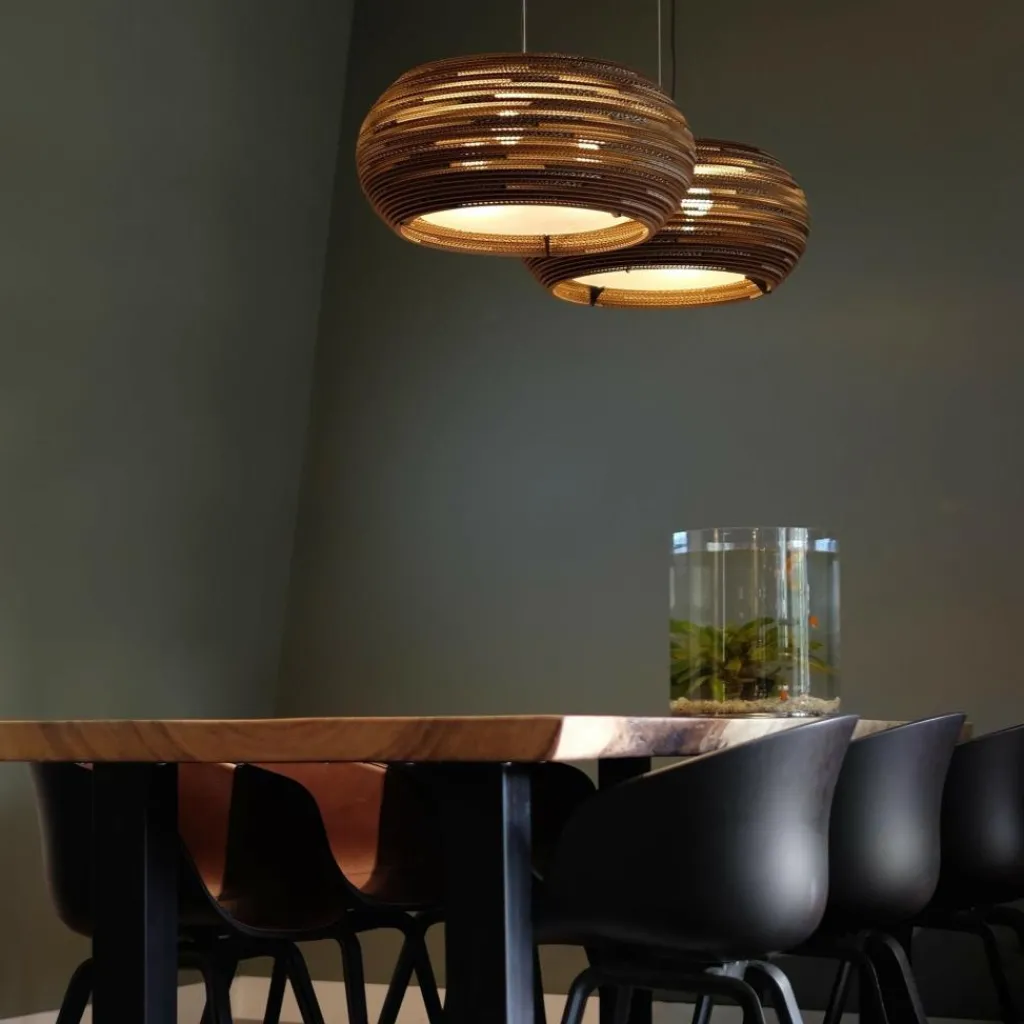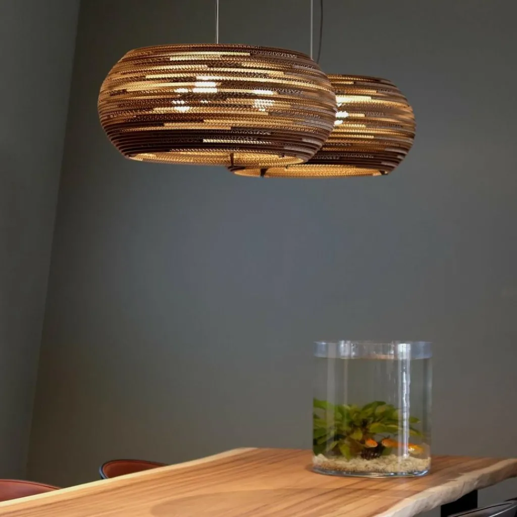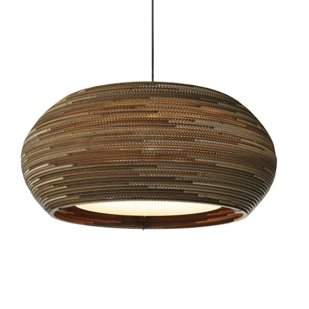 Wer die Ohio Pendelleuchte betrachtet, kommt nicht auf die Idee, dass es sich dabei um ein Recyclingprodukt handelt. Der Leuchtenschirm besteht aus altem Karton und wird von einem Stahlrahmen gehalten. Durch eine spezielle Technik entsteht der fein gerillte Schirm, durch den atmosphärisches Licht dringt. Das Modell passt in jedes Wohn-, Schlaf- oder Esszimmer. Auch in der Gastronomie und der Hotellerie wird es zum Blickfang.