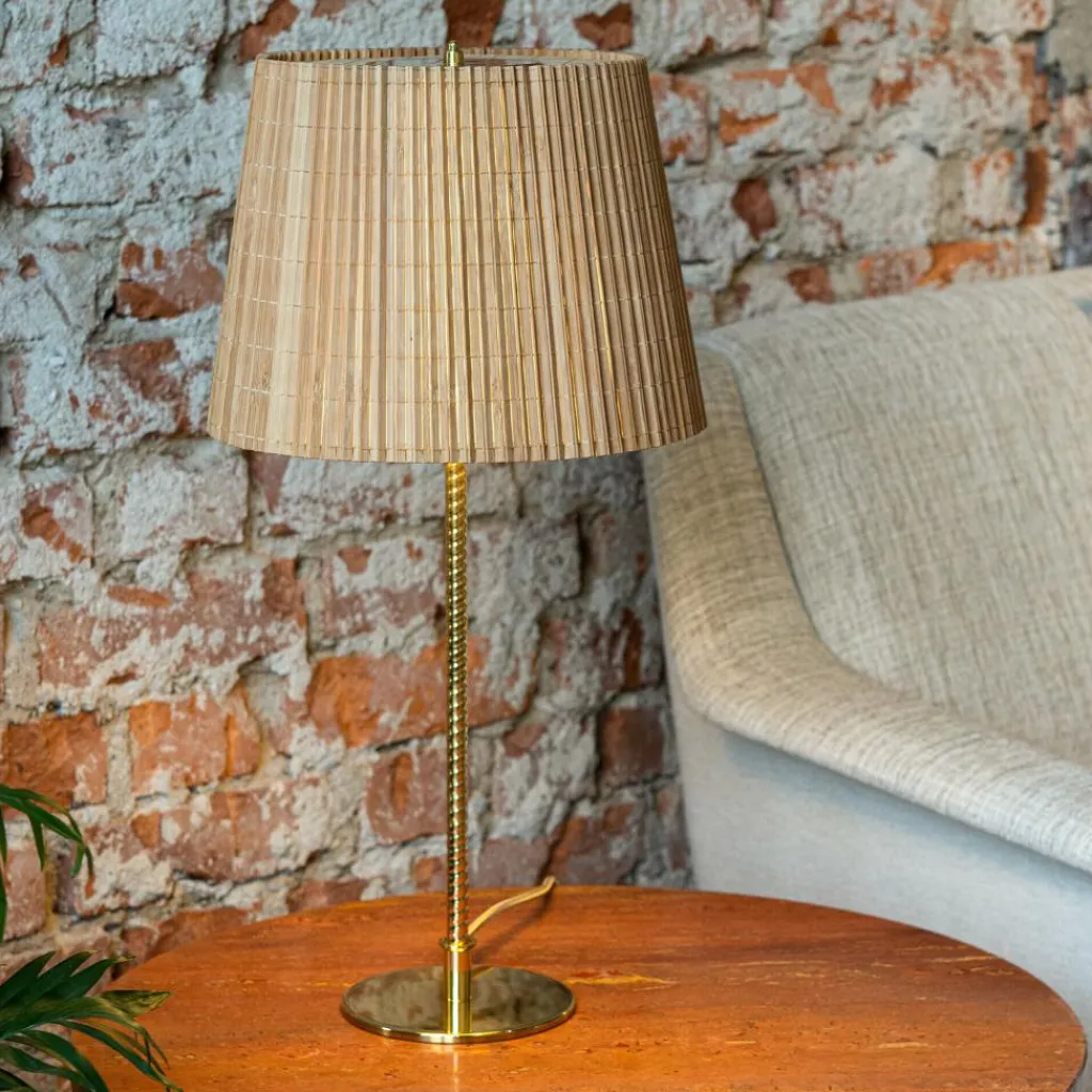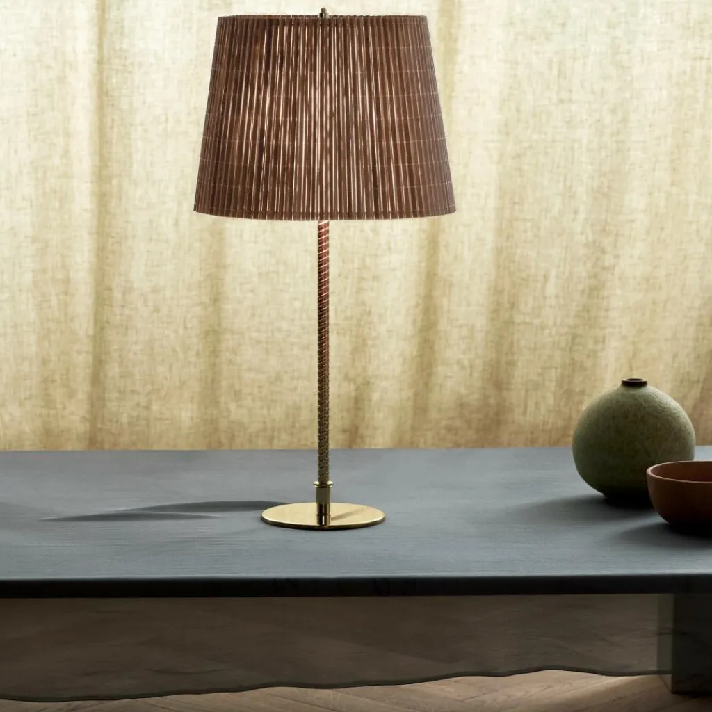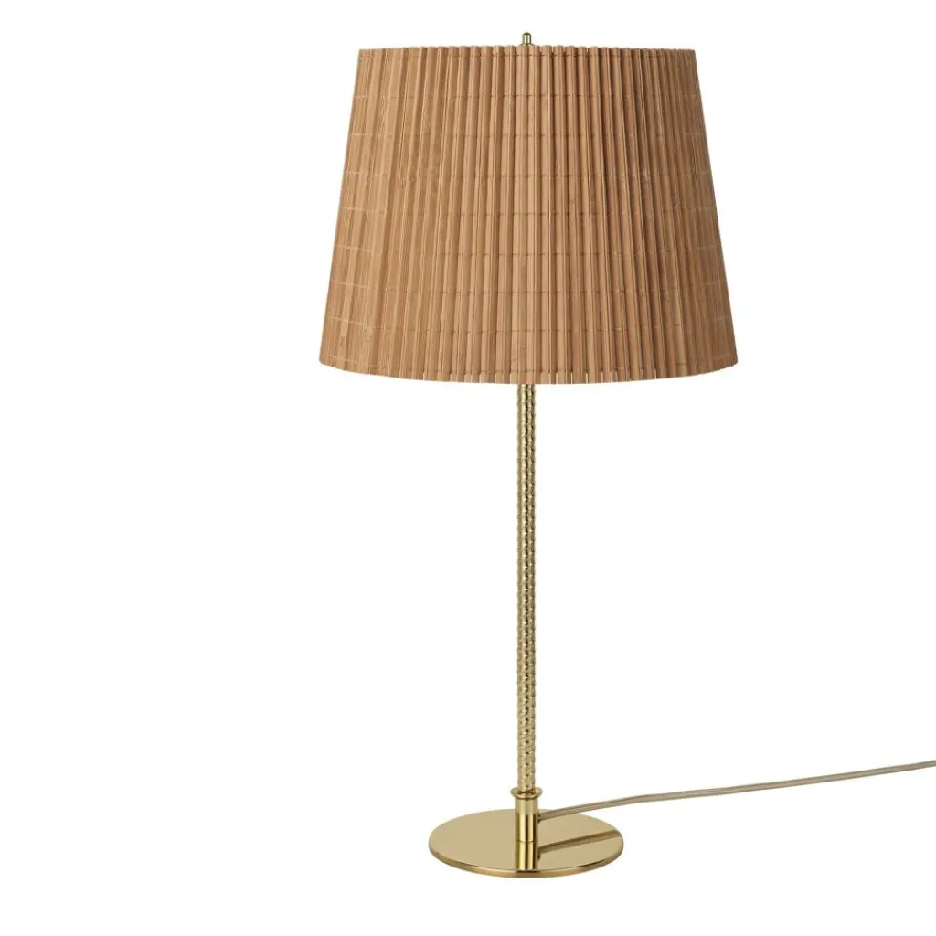 Die 9205 Tischleuchte zeichnet sich mit ihrer schlichten Silhouette aus. Dahinter verbirgt sich ein Meisterwerk an Handwerkskunst: Der Schirm ist an einem Drahtgestell montiert. Es gibt eine Variante mit einem Schirm aus edlem Stoff oder aus Bambus. Das Modell mit Bambus besteht aus Lamellen, die im ersten Arbeitsschritt zu einer Matte zusammengenäht werden. Dann wird sie auf dem Gestell montiert. Der Schirm ist als Zylinder geschnitten, der sich oben etwas verjüngt. Das Licht tritt unten direkt aus und scheint durch den Schirm. Ein runder Sockel dient als Basis. Daraus entspringt ein Stab im Design von Bewehrungsstahl. Das Gestell wird aus Messing gemacht. Das Modell benötigt zwei Leuchtmittel mit E27-Fassung.