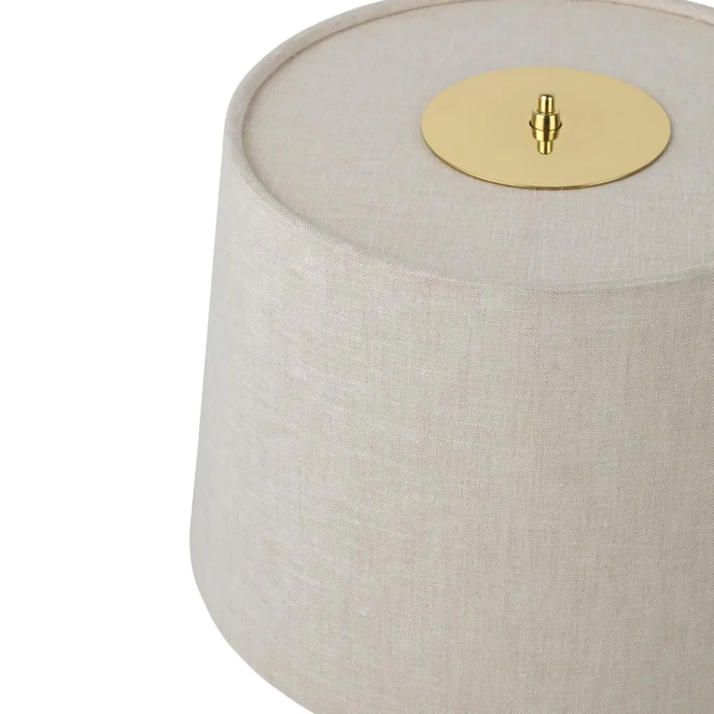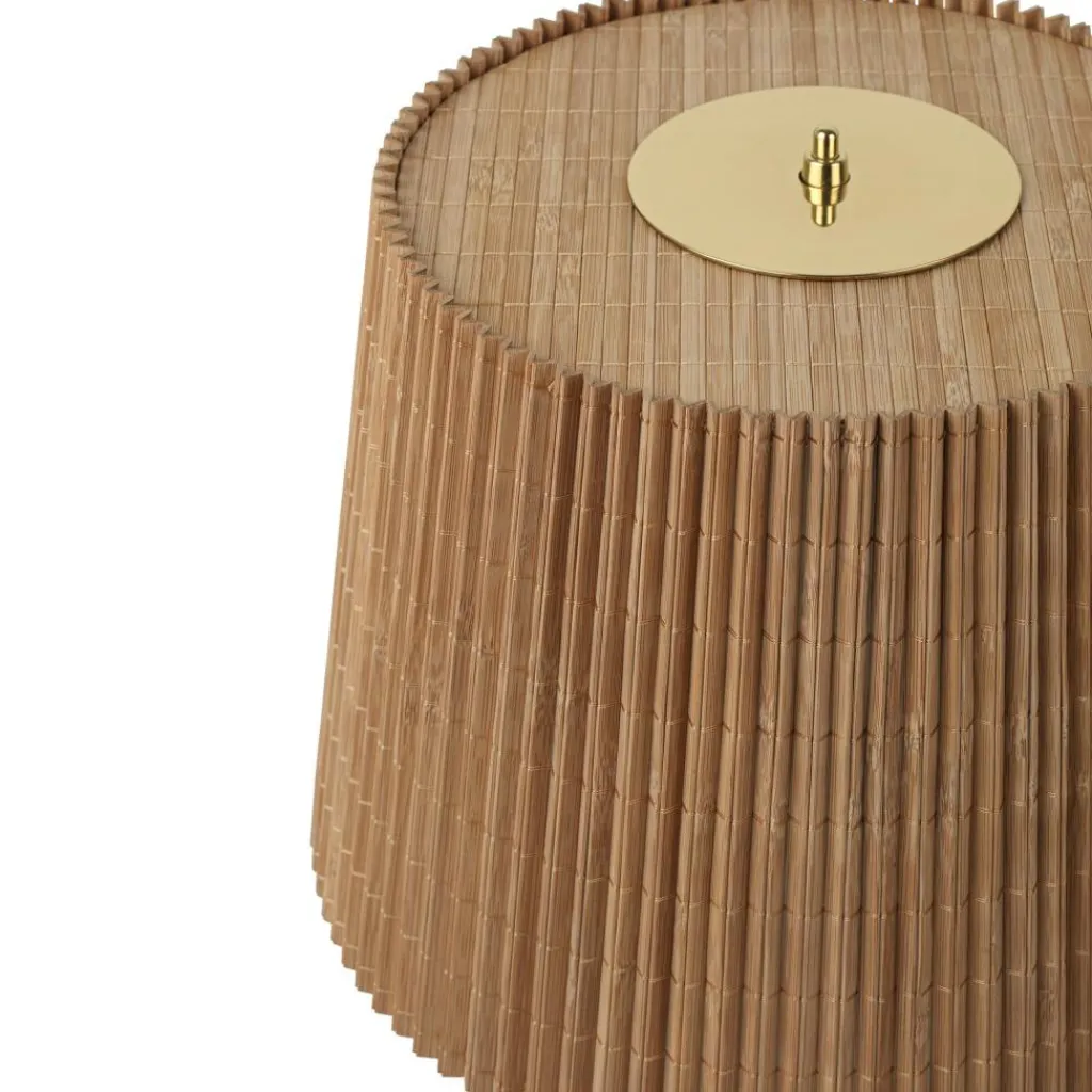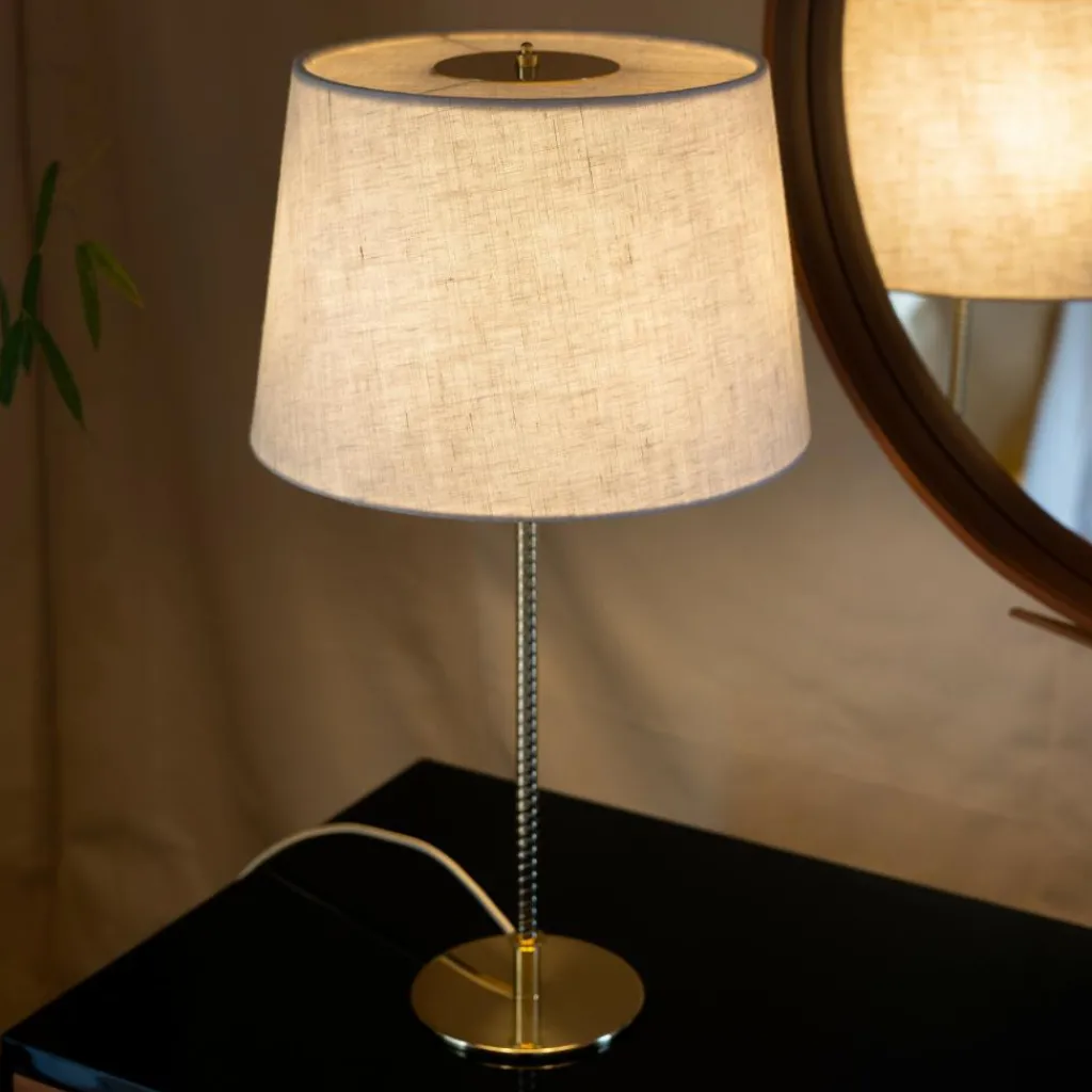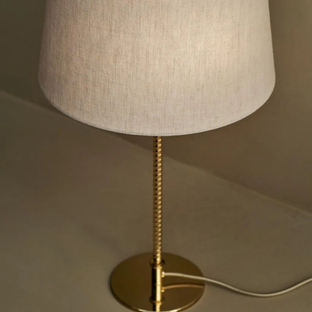 Die 9205 Tischleuchte zeichnet sich mit ihrer schlichten Silhouette aus. Dahinter verbirgt sich ein Meisterwerk an Handwerkskunst: Der Schirm ist an einem Drahtgestell montiert. Es gibt eine Variante mit einem Schirm aus edlem Stoff oder aus Bambus. Das Modell mit Bambus besteht aus Lamellen, die im ersten Arbeitsschritt zu einer Matte zusammengenäht werden. Dann wird sie auf dem Gestell montiert. Der Schirm ist als Zylinder geschnitten, der sich oben etwas verjüngt. Das Licht tritt unten direkt aus und scheint durch den Schirm. Ein runder Sockel dient als Basis. Daraus entspringt ein Stab im Design von Bewehrungsstahl. Das Gestell wird aus Messing gemacht. Das Modell benötigt zwei Leuchtmittel mit E27-Fassung.