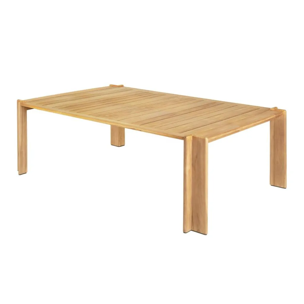 Hergestellt wird der Atmosfera Gartenesstisch 209x105cm aus Teakholz, einem robusten Material. Es ist unempfindlich gegen Witterungseinflüsse und kann daher auch bei schlechtem Wetter im Freien bleiben. Um die goldene Farbe zu erhalten, ist regelmäßiges Einölen zu empfehlen. Markant sind die vier Füße, die jeweils aus zwei senkrechten Latten gebildet werden, die im rechten Winkel zueinander stehen. Die L-förmigen Füße stehen ein wenig über die Tischplatte hinaus, was das Design einzigartig macht. Die Tischplatte ist aus Latten zusammengesetzt. Durch die Spalten dazwischen fließt Feuchtigkeit schnell ab, wenn der Tisch einmal nass wird.
