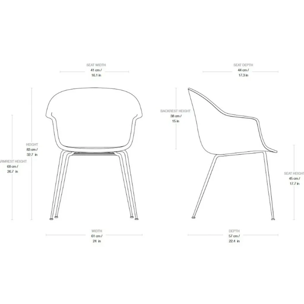 Der Bat Schalenstuhl Vollpolsterung Gestell konisch hat eine maximale Traglast von 110kg. Das Gewicht beträgt 9,4kg. Mit einer Sitzhöhe von 45cm passt der Bat Schalenstuhl Vollpolsterung Gestell konisch zu beliebigen Tischen zu Hause oder im Büro. Die Höhe der Armlehnen beträgt 68cm. Der Stuhl ist 61cm breit und 57cm tief. Die Höhe beträgt 83cm.
