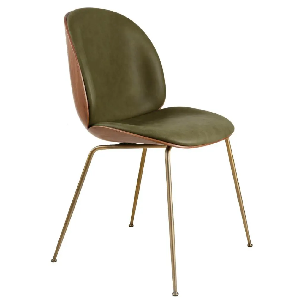 Der Beetle 3D Veneer Stuhl Leder gepolstert von Gubi ist ein ausdrucksstarkes Designstatement, das Komfort, Handwerkskunst und natürliche Materialien harmonisch vereint.