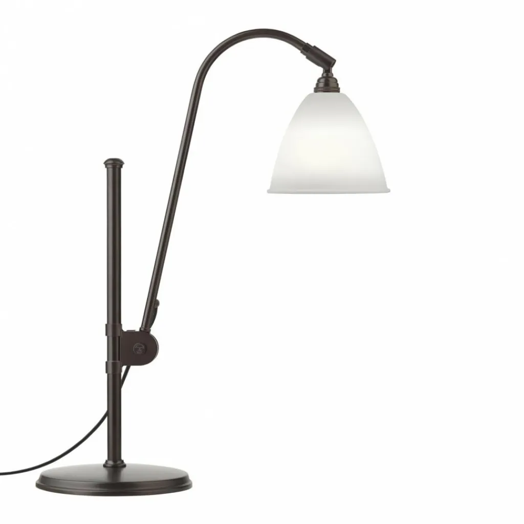 In den 1930er Jahren galt die Bestlite BL1 Tischleuchte Gestell Messing schwarz als Pionier unter den verstellbaren Schreibtischleuchten. Das ist mit ein Grund, warum sie von den Juwelieren im Birminghamer Juwelierviertel genutzt wurde. Mit Hilfe eines Rädchens, das am Messinggestell der Leuchte angebracht ist, lässt sie sich flexibel in der Höhe verstellen. Ein geschwungener Stab führt zum Leuchtenschirm, der aus Porzellan gefertigt ist. Er erinnert in seiner Form deutlich an eine Glocke.
