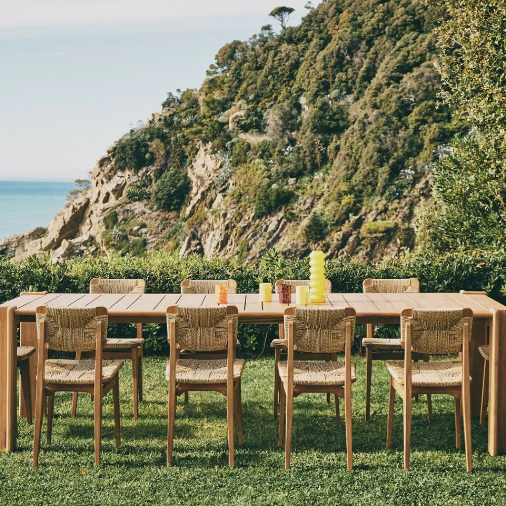 Der C-Chair Outdoor Dining Chair ist eine stilvolle Sitzgelegenheit für den Outdoorbereich: Er kann auf der Terrasse oder dem Balkon aufgestellt werden, wird jedoch auch gerne von Restaurantbetreibern im Freibereich verwendet. Die Silhouette des C-Chair Outdoor Dining Chairs wurde so gestaltet, dass maximaler Sitzkomfort garantiert ist. Für den Rahmen verwendet Gascoin Teakholz, das aus Asien stammt und witterungsbeständig ist. Durch den hohen Ölgehalt des Naturmaterials kann Regen dem C-Chair Outdoor Dining Chair nichts anhaben. Wird der C-Chair Outdoor Dining Chair nicht regelmäßig eingeölt, erhält er eine besondere Patina. Die Sitzfläche und die Rückenlehne sind aus einer für den Outdoorbereich geeigneten Faser aus Polyethylen hergestellt. Sie wird zu einem ansprechenden Muster verwoben. An den Beinenden sind Beschläge aus Edelstahl mit Kunststoffgleitern montiert.