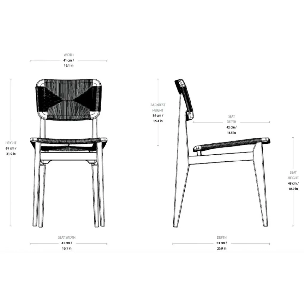 Der C-Chair Outdoor Dining Chair wiegt 5,7 kg. Der Stuhl ist 41 cm breit und 53 cm tief. Die Höhe beträgt 81 cm. Der C-Chair Outdoor Dining Chair hat eine Sitzhöhe von 48 cm. Er passt hervorragend zu Tischen aus Teakholz.