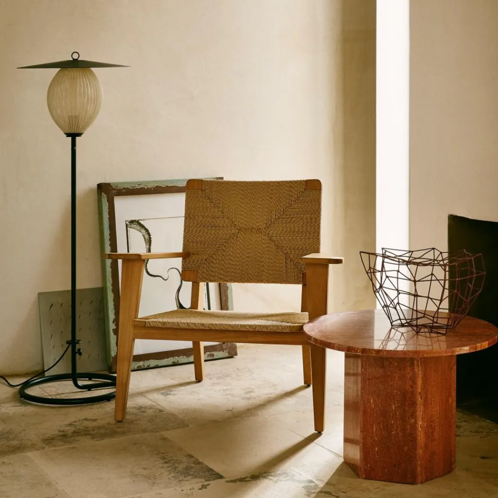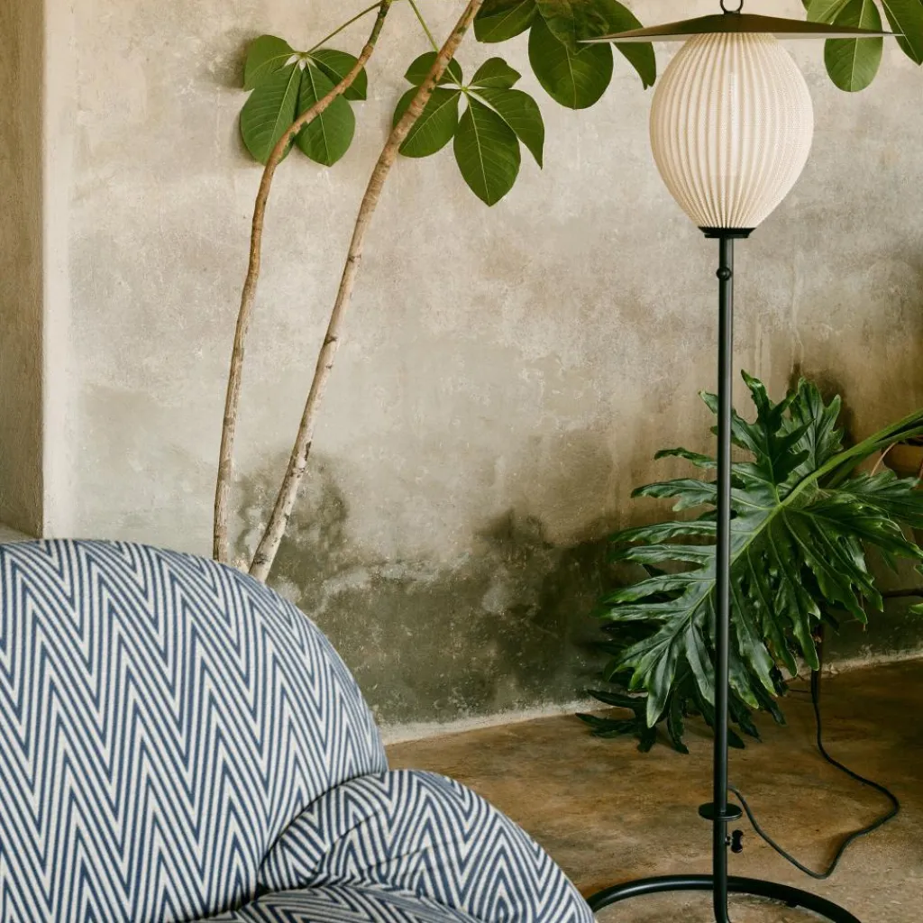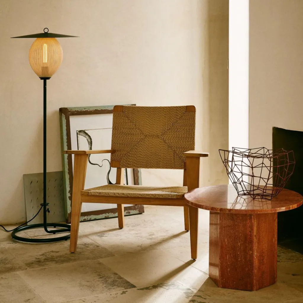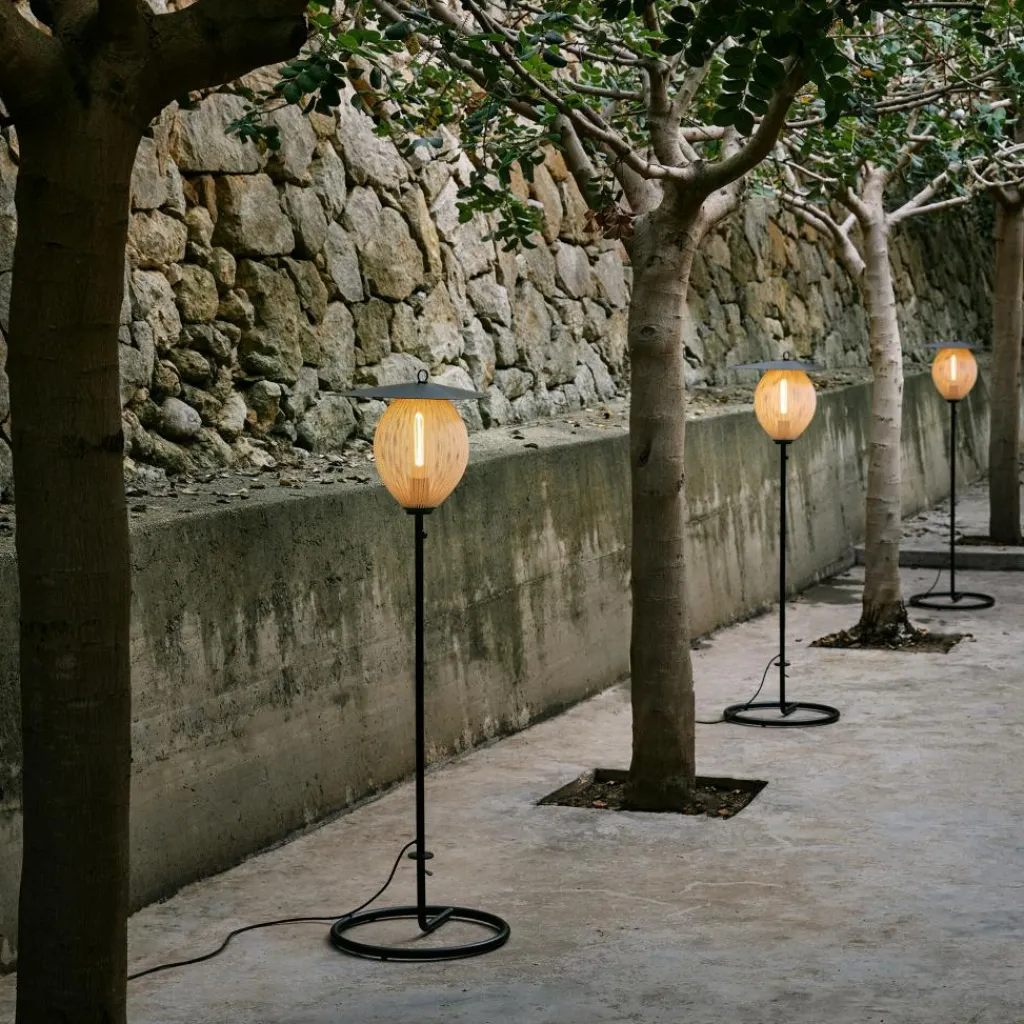 Die Satellite Outdoor Stehleuchte wurde von Mathieu Matégot für die Marke Gubi entworfen. Sie gehört zu einer Kollektion stilvoller Leuchten, die auch Pendelleuchten umfasst. Da das Modell in Schutzart IP65 gefertigt ist, eignet es sich perfekt für den Außenbereich.