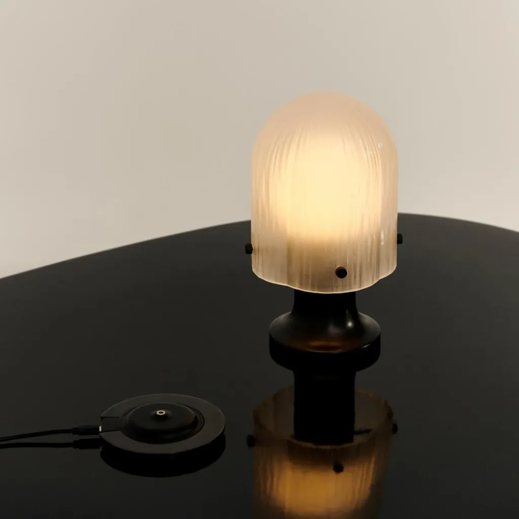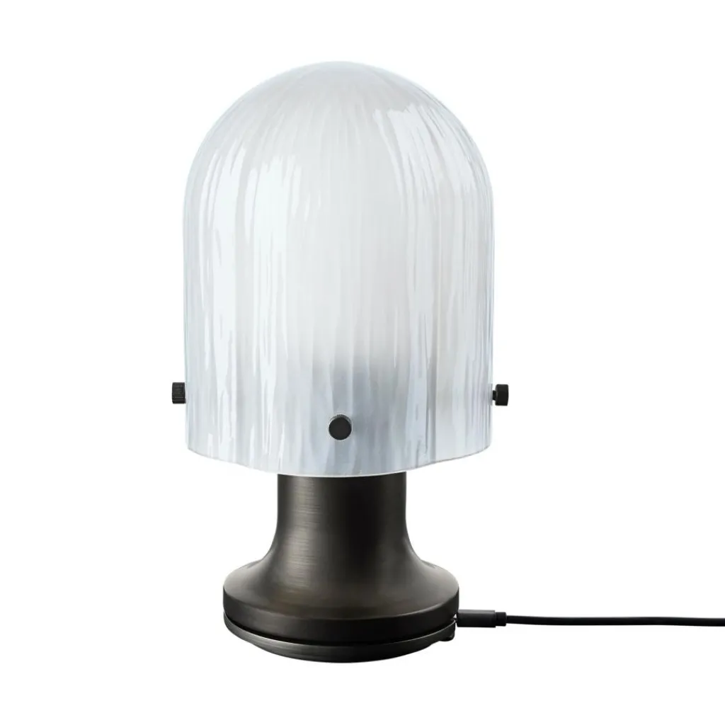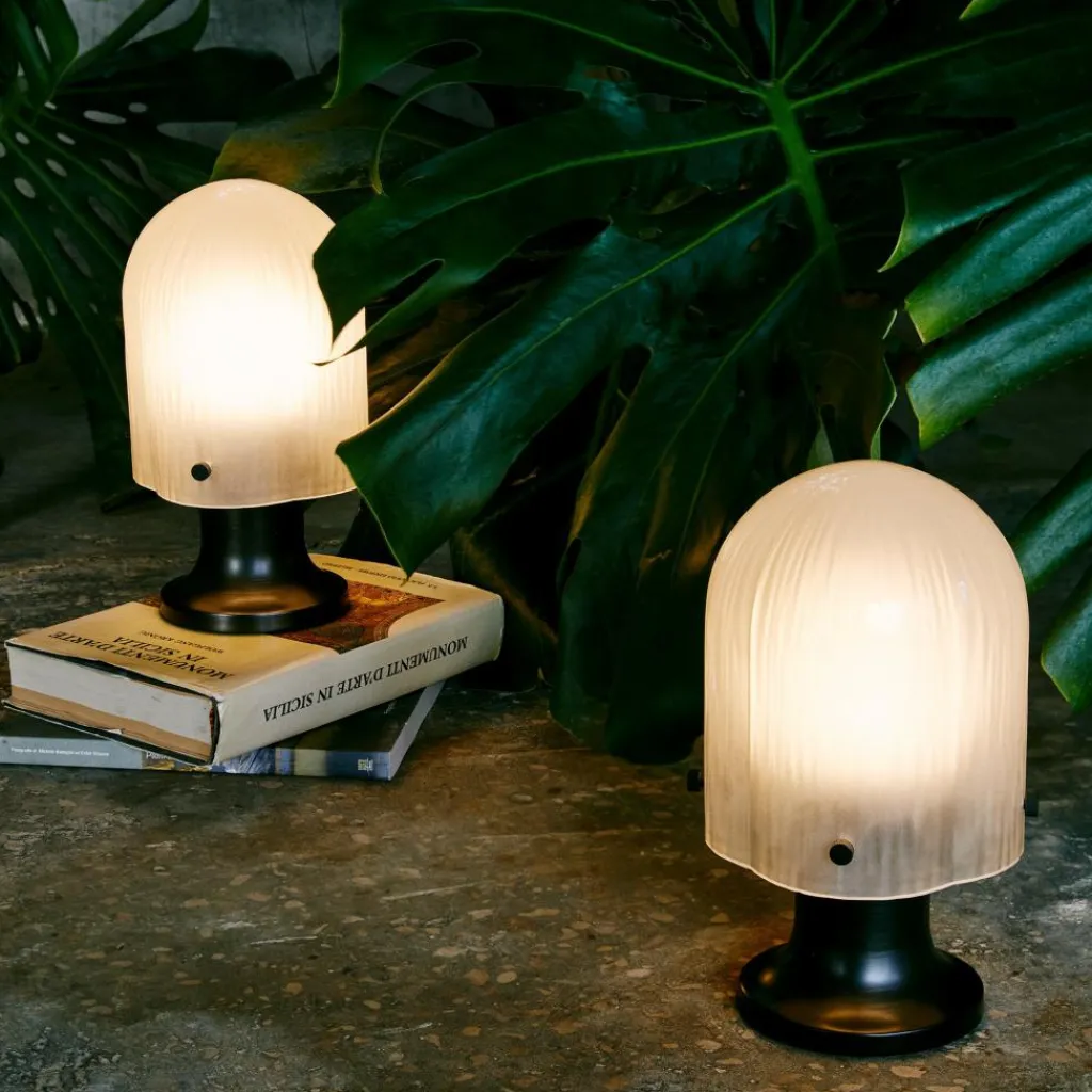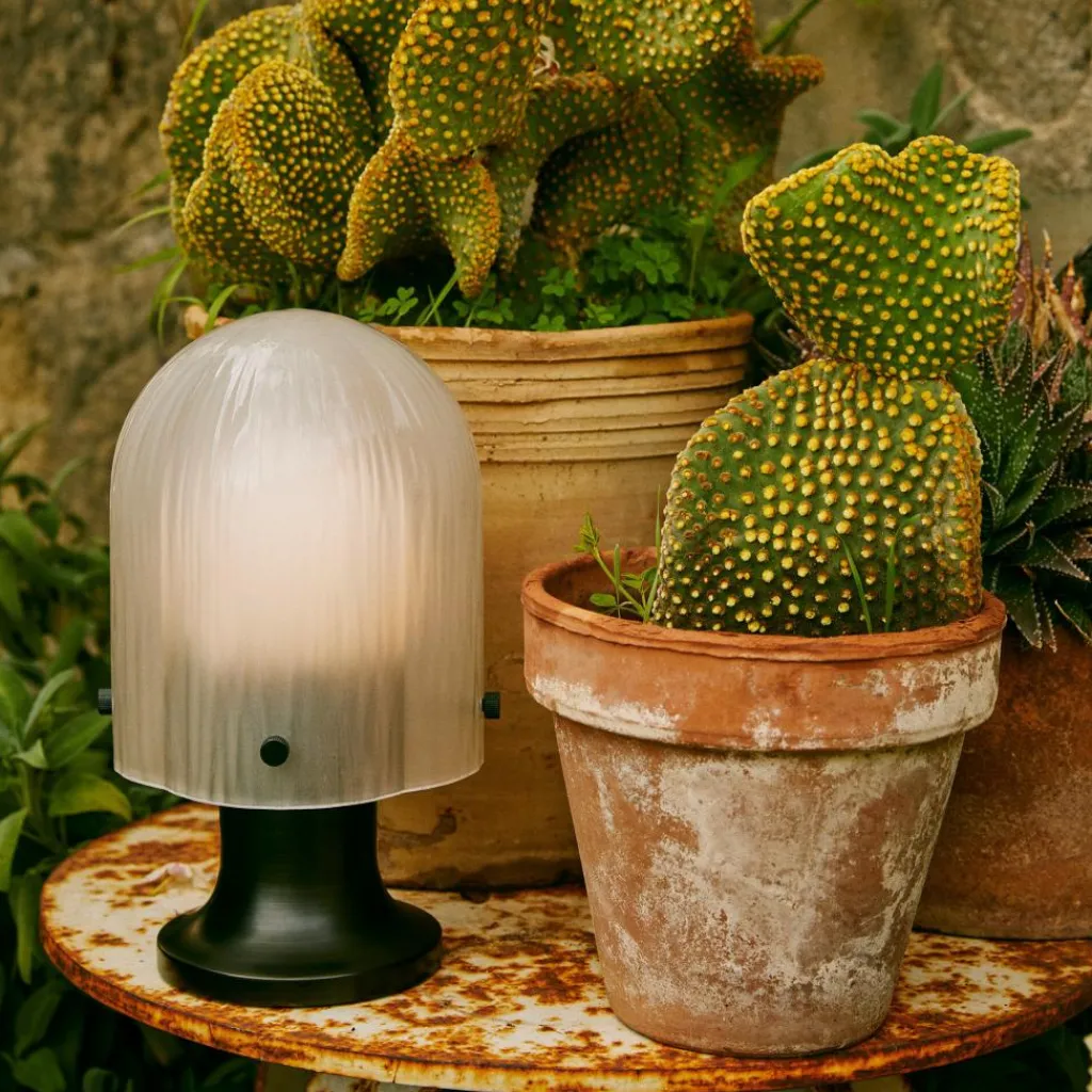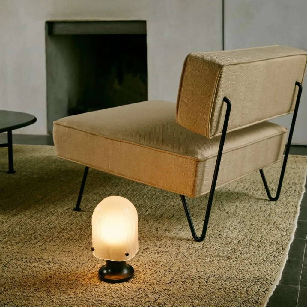 Die Seine Outdoor Akkuleuchte wurde von Space Copenhagen für die Marke Gubi entworfen. Die Inspiration fanden die Designer in der Natur: Die Leuchte soll die Lichteffekte am Morgen auf einer Wasserfläche einfangen.