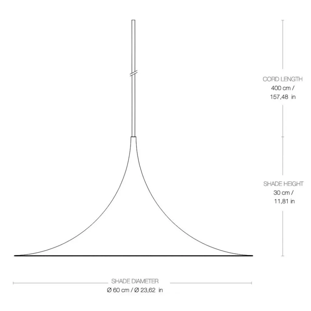 Mit ihrem Durchmesser von 60cm ist die Pendelleuchte die größte aus der kultigen Leuchtenkollektion. Ihr Schirm misst 30cm in der Höhe. Der Durchmesser ihres Baldachins ist 11,5cm. Dank ihres 400cm langen Textilkabels lässt sich die hippe Designleuchte auch in hohen Räumen einsetzen. Die Semi Pendelleuchte Ø60cm wiegt 2kg und benötigt ein Leuchtmittel mit E27-Fassung.