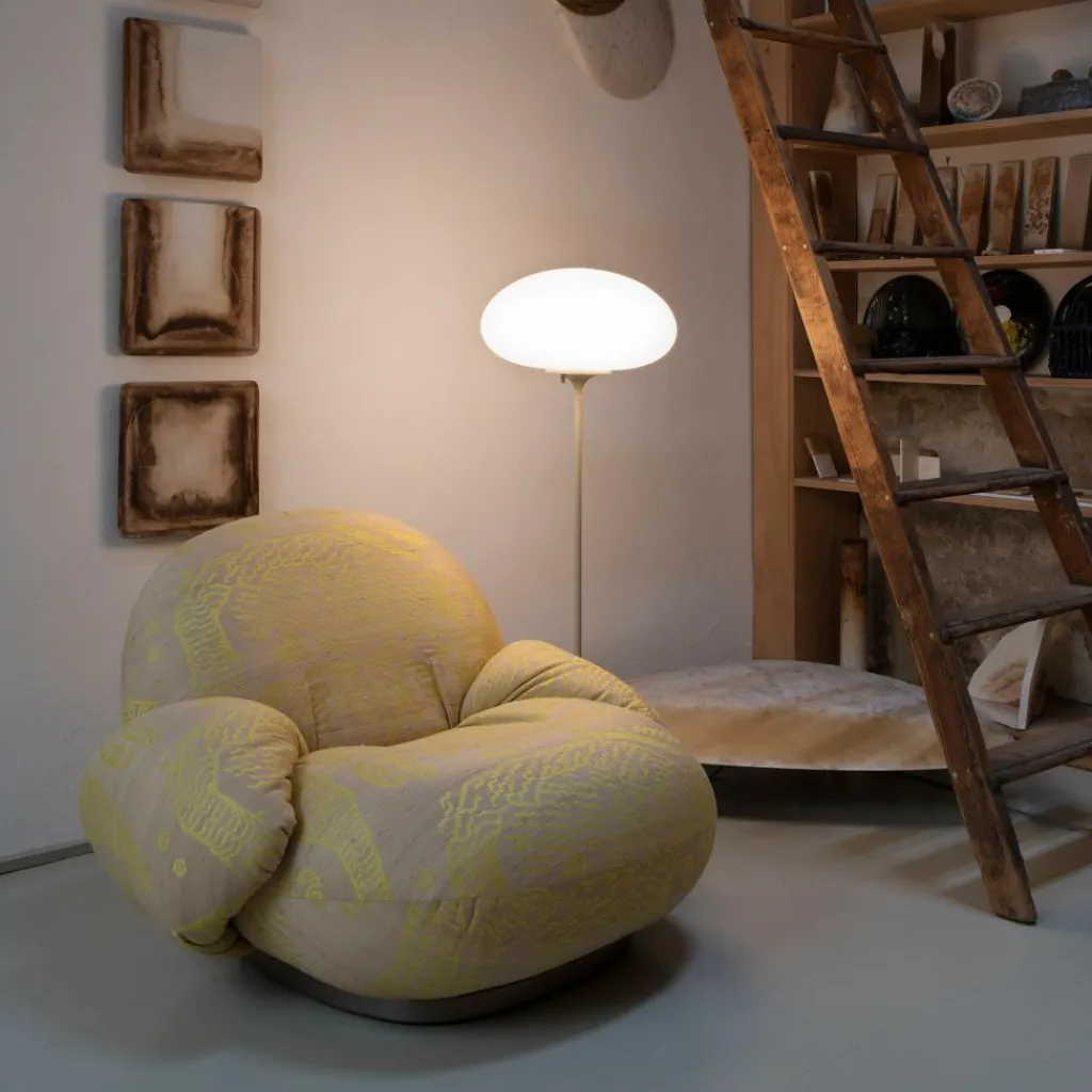 Bei der Stemlite Stehleuchte H 110cm handelt es sich um eine in sich geschlossene Einheit, die dennoch den Austausch einzelner Module zulässt. Ihr einzigartiges Design wurde vom Industrial Design Magazine anerkannt: Es wählte das Modell im Jahr 1965 zur einflussreichsten Leuchte des Jahres. Berühmtheit erlangte die Stemlite-Serie, als sie am Set der beliebten Fernsehserie Star Wars eingesetzt wurde. Mit ihrem mundgeblasenen Leuchtenschirm, der auf einem schlanken Fuß aus Stahl sitzt, wirkt sie wie von einem anderen Stern.