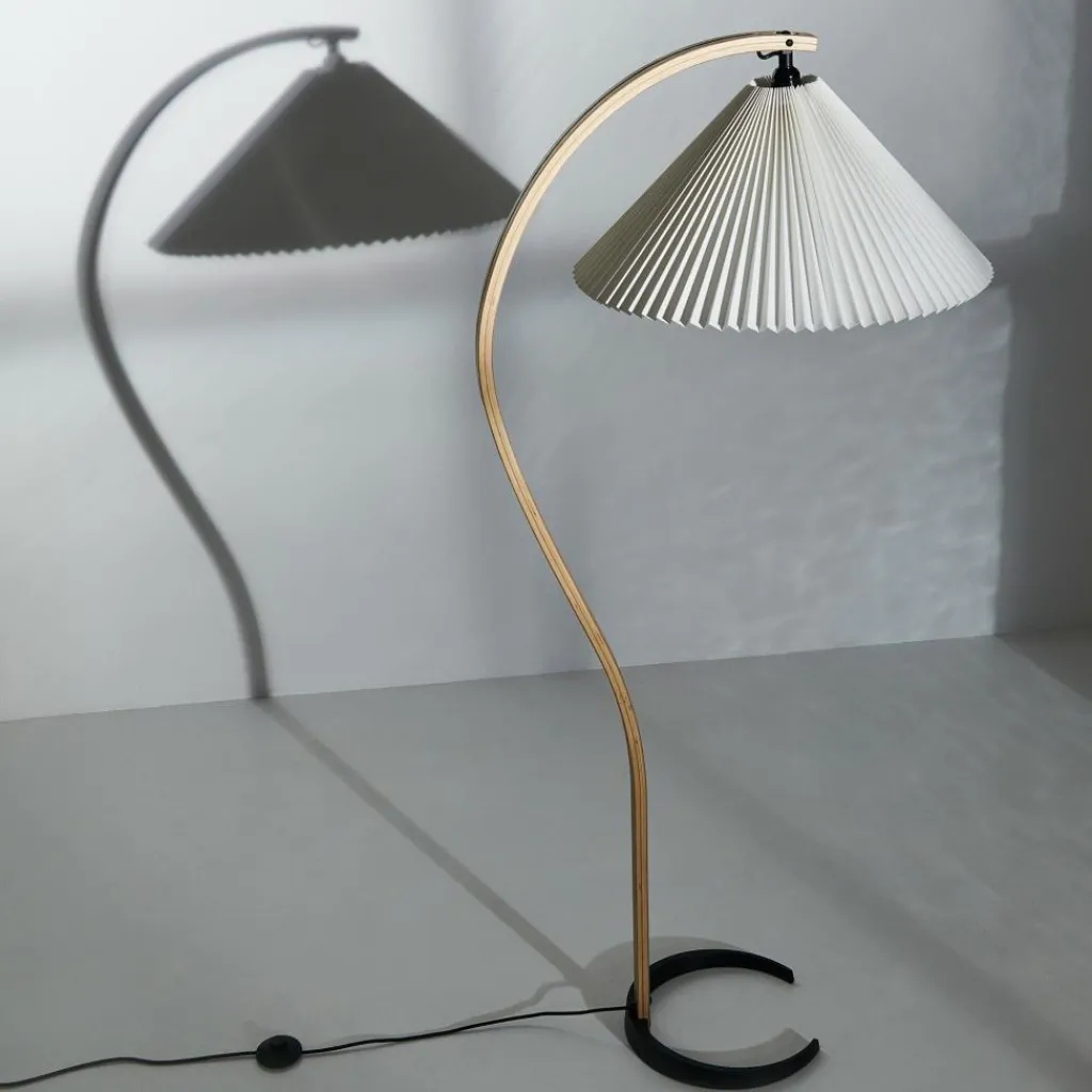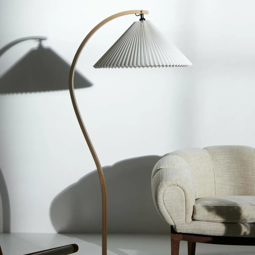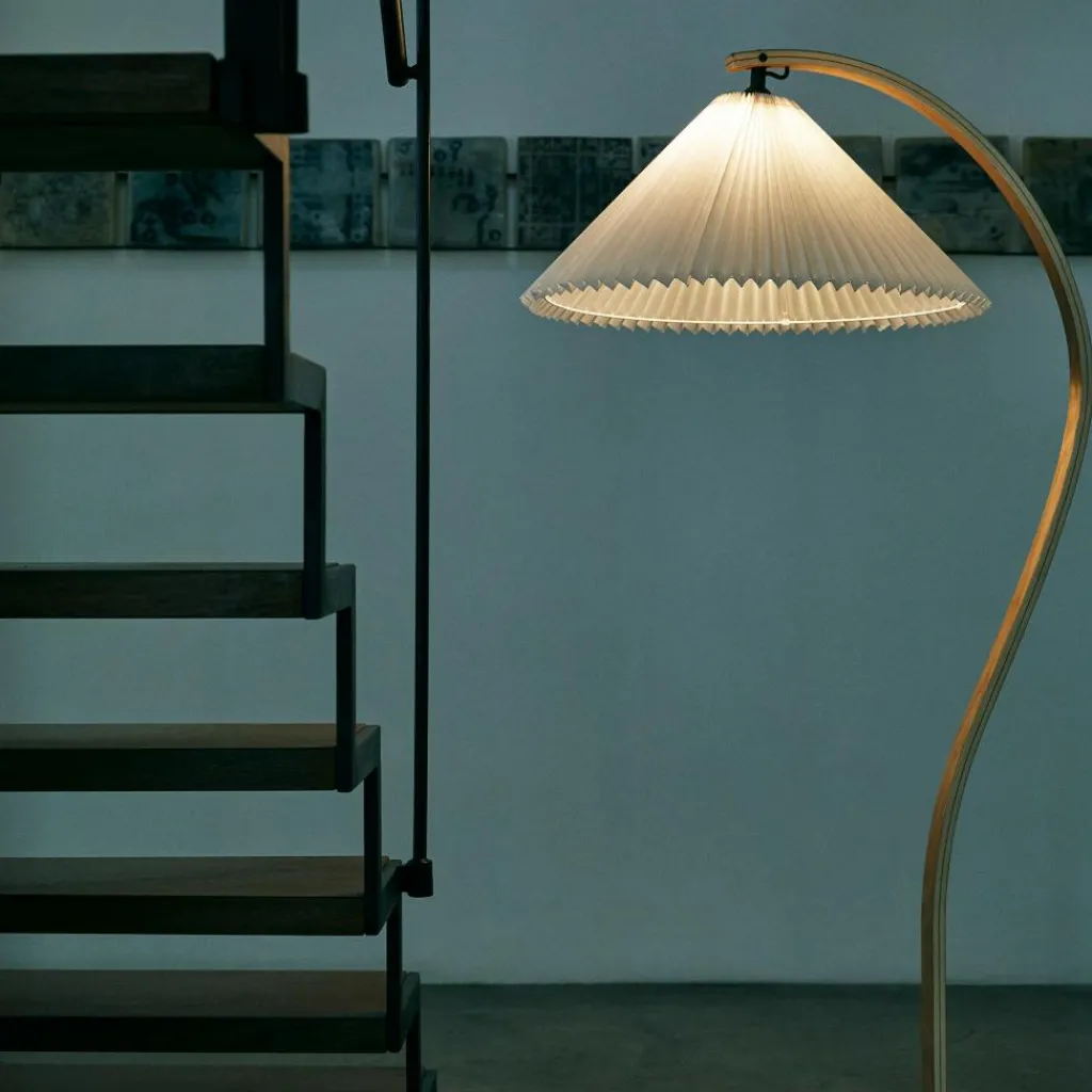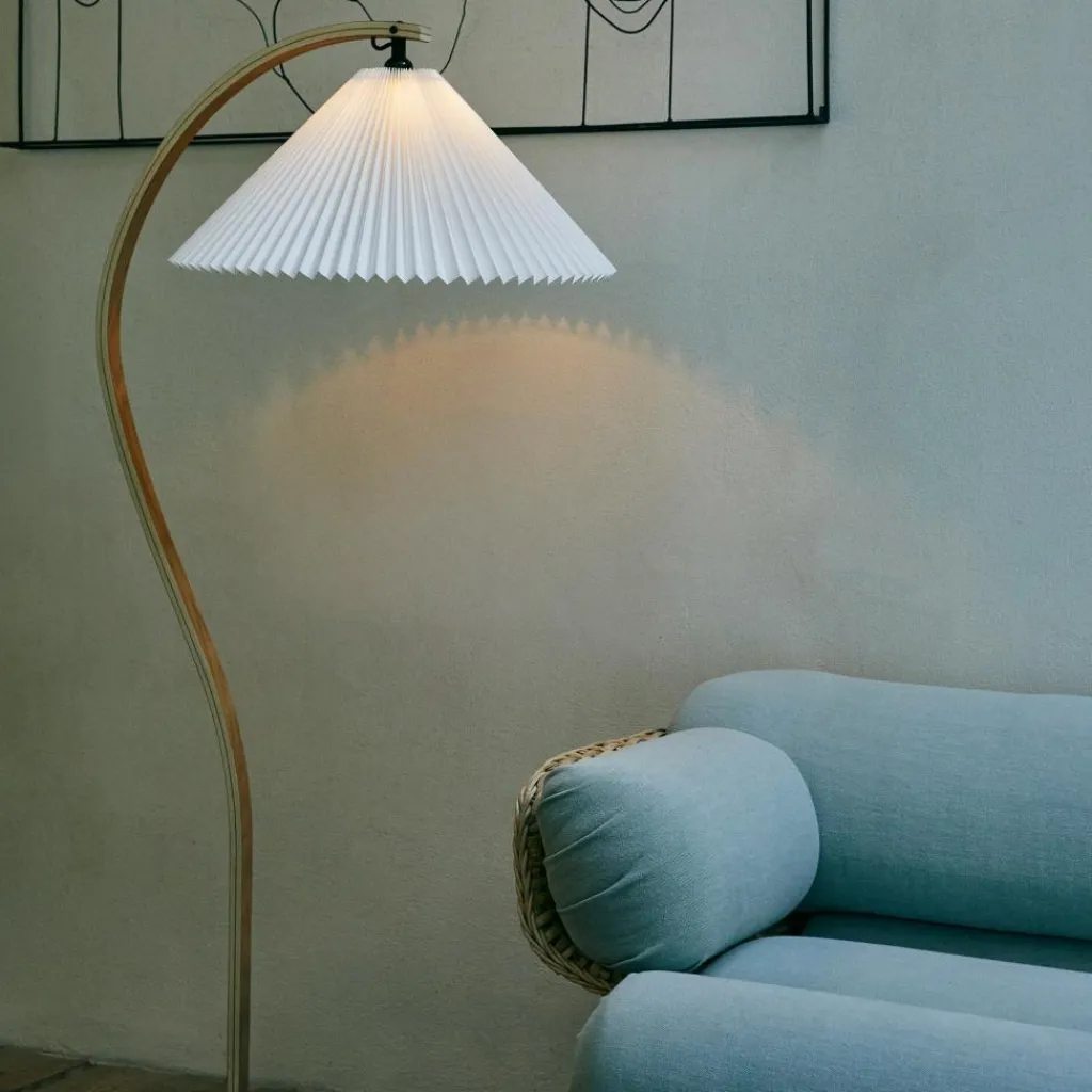 Mit ihrem hellen Plisseeschirm aus Leinengewebe, dem sichelförmigen Fuß aus dunklem Gusseisen und dem geschwungenen Stiel aus Furnierholz hat die Timberline Stehleuchte materielle wie formale Kontraste zum Thema. Der geradlinige Faltenwurf des Schirms korrespondiert mit den Kurven des Standbeins. Seine kegelige Form und das durchscheinende Material stehen im Kontrast zum schweren, aber minimalistisch ausgeführten Leuchtenfuß. Dieser sorgt für eine hohe Stabilität, während der Schirm einen gut ausgeleuchteten Lichtkegel nach unten lenkt und nach oben ein angenehm diffuses Licht durchscheinen lässt. Mit ihren natürlichen Farbtönen und dem sanft gemusterten Stiel aus Eichen- und Birkenholz fügt sich die Timberline Stehleuchte harmonisch ins Wohnzimmer ein und passt ebenso in repräsentative Empfangsräume oder Hotels.