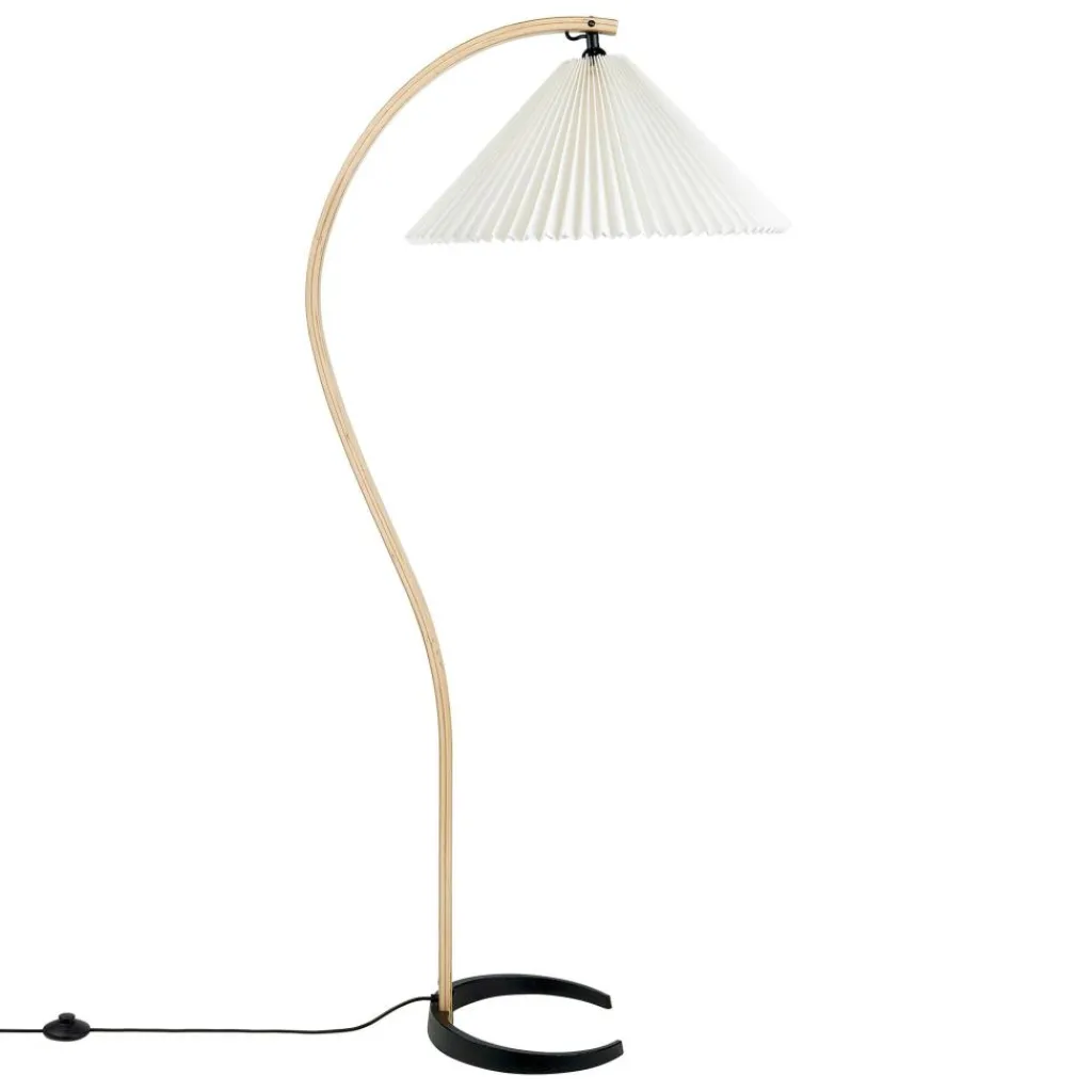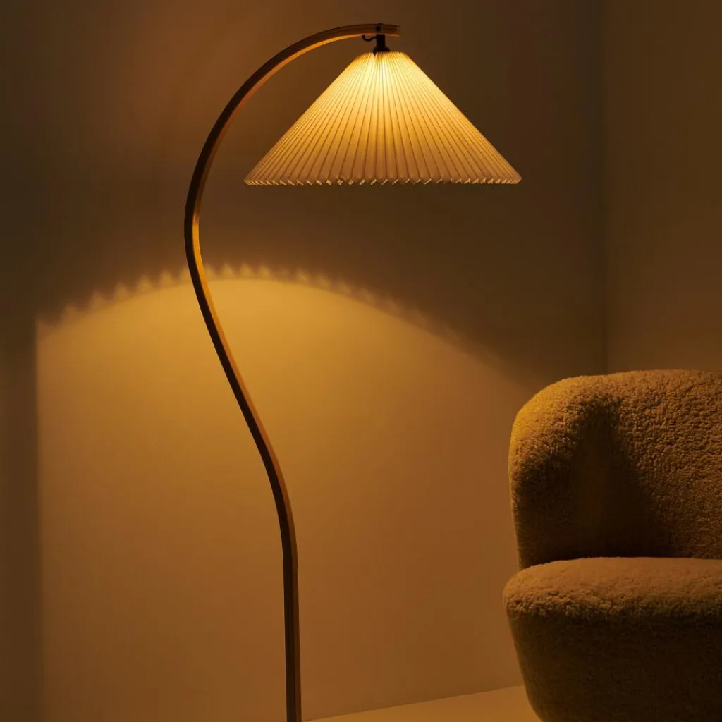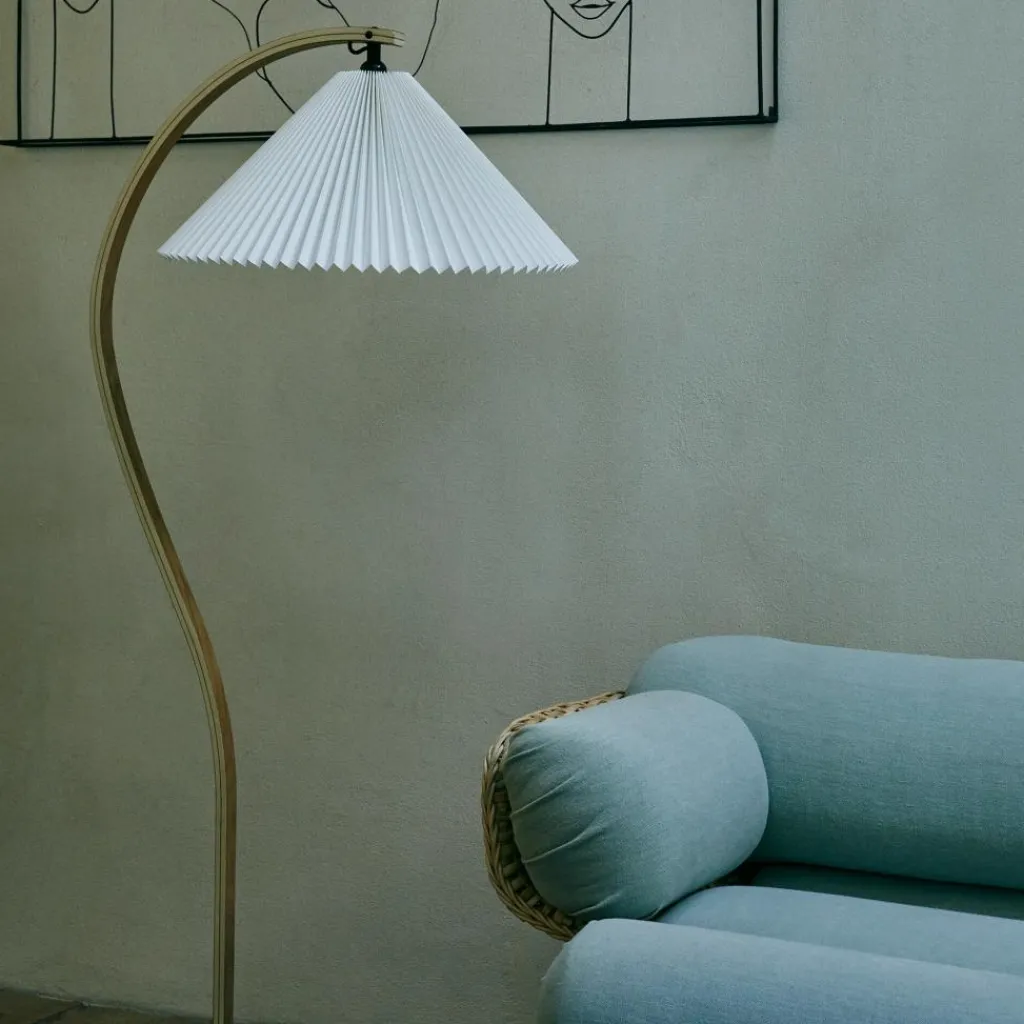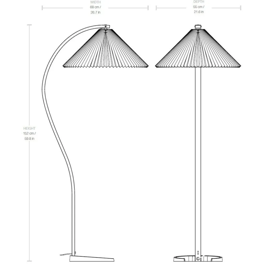 Mit ihrem hellen Plisseeschirm aus Leinengewebe, dem sichelförmigen Fuß aus dunklem Gusseisen und dem geschwungenen Stiel aus Furnierholz hat die Timberline Stehleuchte materielle wie formale Kontraste zum Thema. Der geradlinige Faltenwurf des Schirms korrespondiert mit den Kurven des Standbeins. Seine kegelige Form und das durchscheinende Material stehen im Kontrast zum schweren, aber minimalistisch ausgeführten Leuchtenfuß. Dieser sorgt für eine hohe Stabilität, während der Schirm einen gut ausgeleuchteten Lichtkegel nach unten lenkt und nach oben ein angenehm diffuses Licht durchscheinen lässt. Mit ihren natürlichen Farbtönen und dem sanft gemusterten Stiel aus Eichen- und Birkenholz fügt sich die Timberline Stehleuchte harmonisch ins Wohnzimmer ein und passt ebenso in repräsentative Empfangsräume oder Hotels.