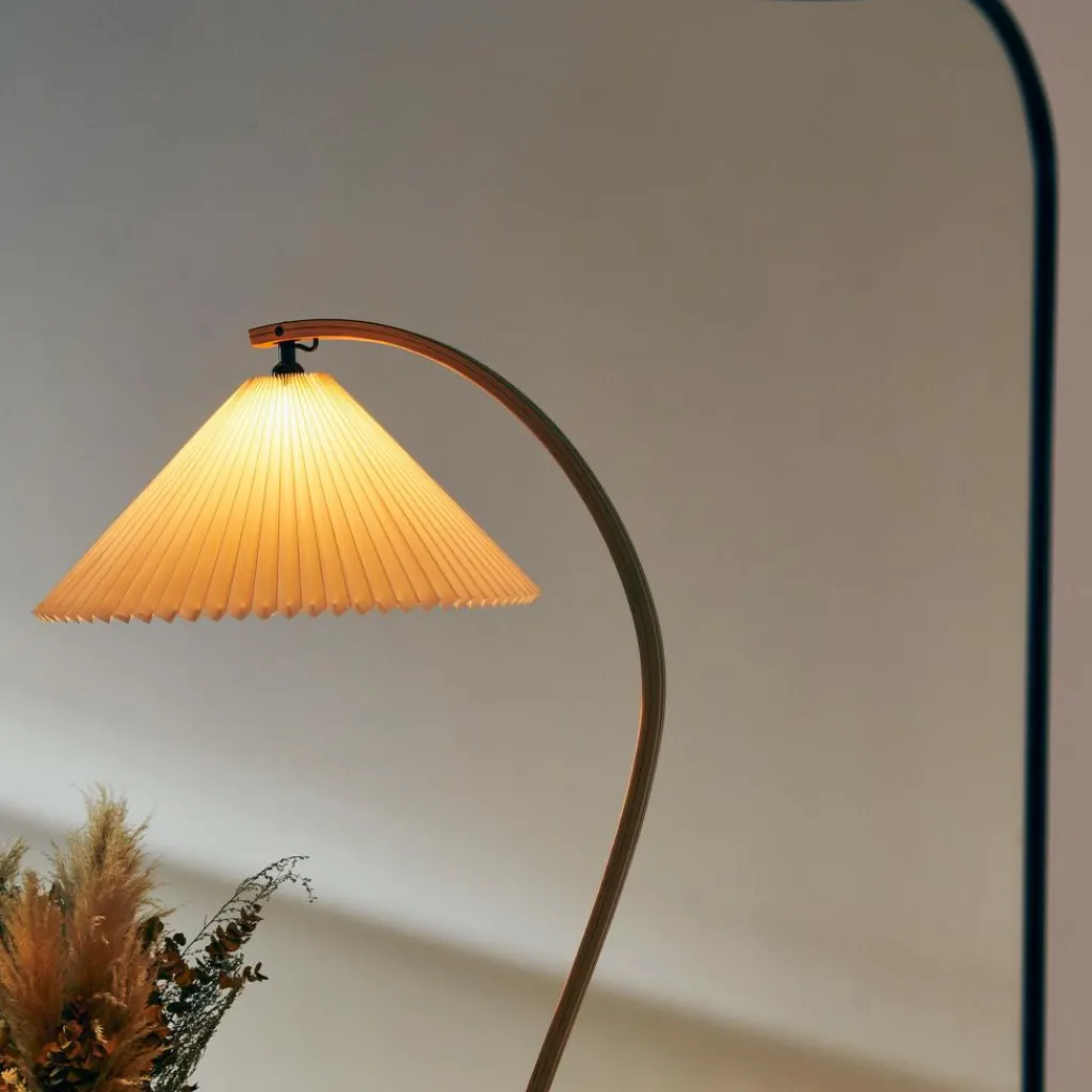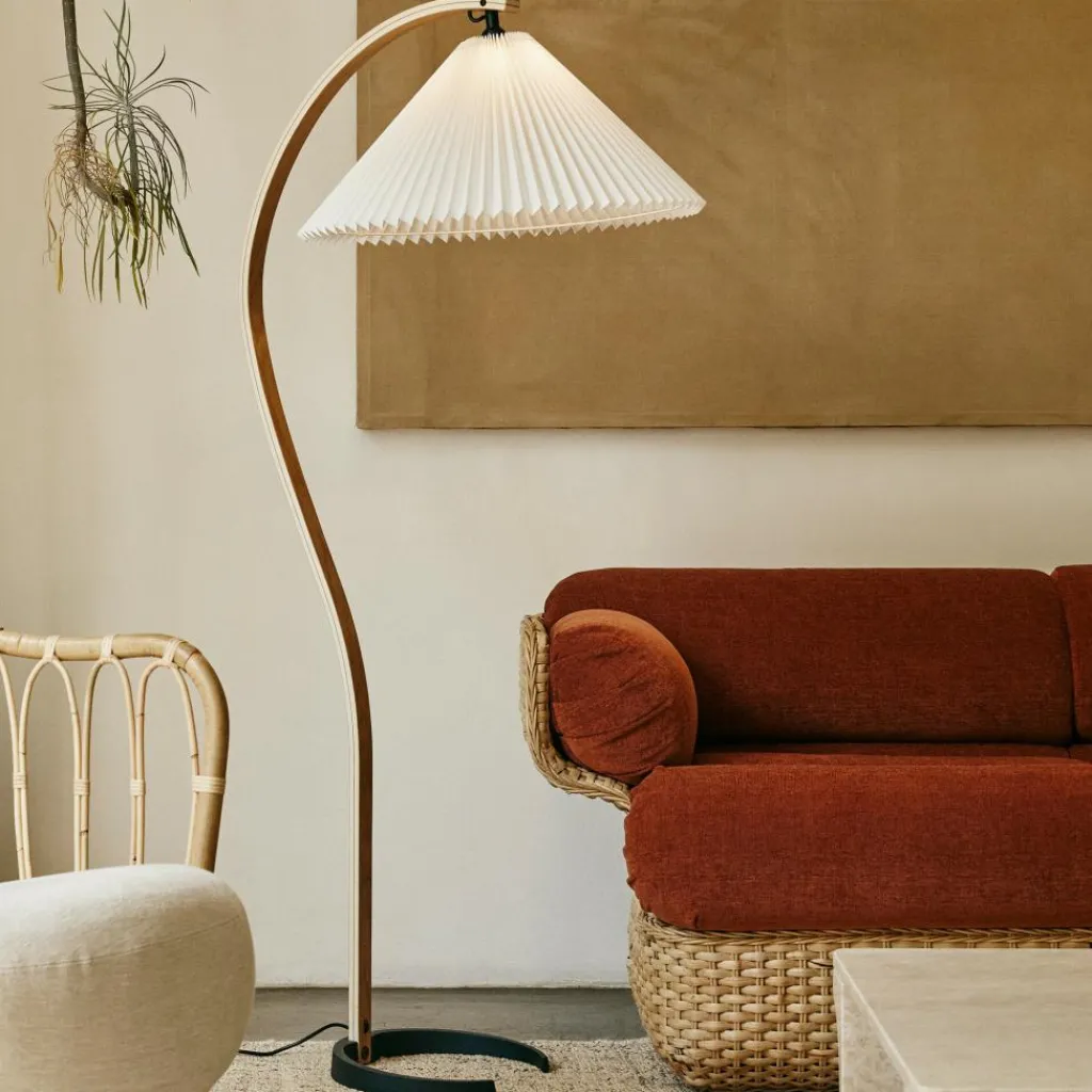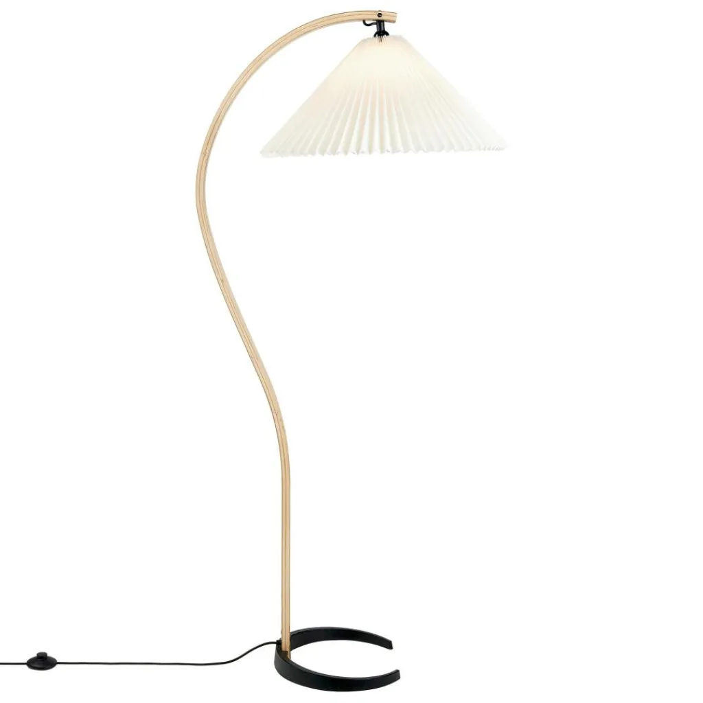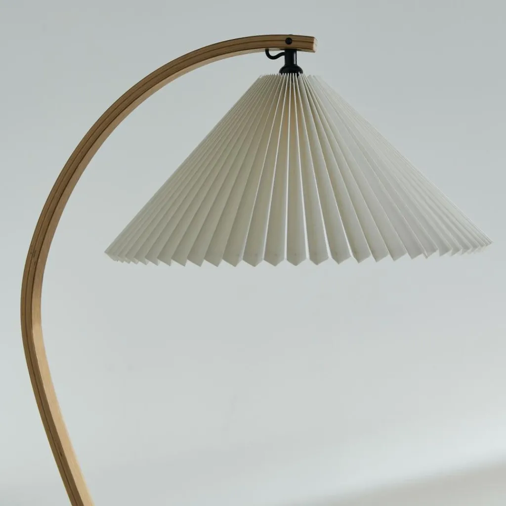 Mit ihrem hellen Plisseeschirm aus Leinengewebe, dem sichelförmigen Fuß aus dunklem Gusseisen und dem geschwungenen Stiel aus Furnierholz hat die Timberline Stehleuchte materielle wie formale Kontraste zum Thema. Der geradlinige Faltenwurf des Schirms korrespondiert mit den Kurven des Standbeins. Seine kegelige Form und das durchscheinende Material stehen im Kontrast zum schweren, aber minimalistisch ausgeführten Leuchtenfuß. Dieser sorgt für eine hohe Stabilität, während der Schirm einen gut ausgeleuchteten Lichtkegel nach unten lenkt und nach oben ein angenehm diffuses Licht durchscheinen lässt. Mit ihren natürlichen Farbtönen und dem sanft gemusterten Stiel aus Eichen- und Birkenholz fügt sich die Timberline Stehleuchte harmonisch ins Wohnzimmer ein und passt ebenso in repräsentative Empfangsräume oder Hotels.