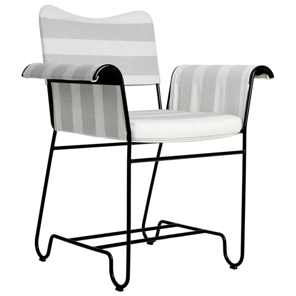 Inspiriert wurde der Designer von der Jet-Set-Szene, die in der Mitte des 20. Jahrhunderts an der Côte d’Azur zu Gast war. So entwarf er im Jahr 1951 den leichten und eleganten Tropique Outdoor Armlehnstuhl Gestell schwarz,der richtig Lust auf den Aufenthalt im Freien macht. Das Gestell besteht aus Stahlrohr. An der Unterseite der Füße, die aus vier harmonischen Bögen bestehen, sind Kunststoffgleiter zur Schonung empfindlicher Terrassenböden montiert. Die nach außen gebogenen Armlehnen tragen zum harmonischen Erscheinungsbild bei. Die Rücken- und Armlehnen, die Sitzfläche sowie das darüber liegende Schaumstoffpolster bestehen aus wetterfestem Stoff. Er trocknet rasch ab. Somit kann der Tropique Dining Chair Gestell schwarz nach einem Regenguss rasch wieder verwendet werden. Ähnlich wie bei einer Hängematte passt sich die Sitzfläche individuell an die Körperkontur an.