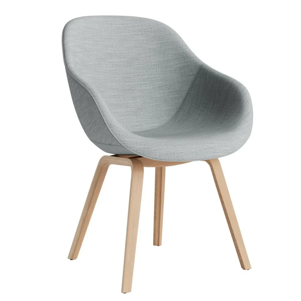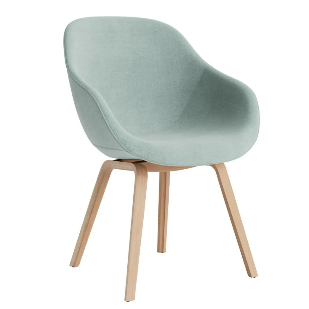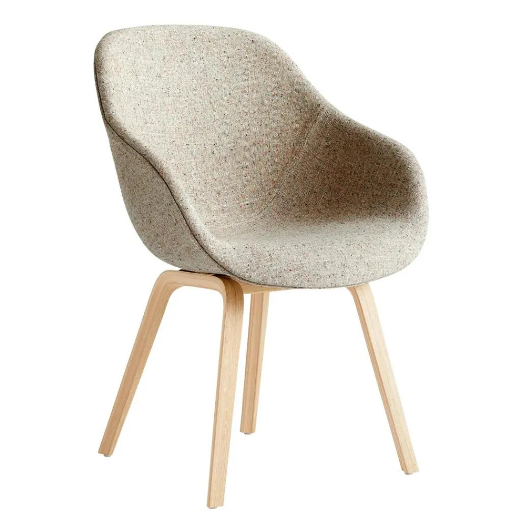 Die Basis des About a Chair 123 Armlehnstuhl bilden vier Füße, die leicht ausgestellt sind. An der Unterseite des Gestells aus matt lackiertem Eichenholz sind Kunststoffgleiter befestigt, die empfindliche Böden schonen. Wie die gesamte Serie About a Chair ist auch bei diesem Modell eine einladende Sitzschale auf dem Modell befestigt. Beim About a Chair 123 Armlehnstuhl ist die Schale aus 10 mm dickem Polypropylen mit einem 20 bis 50 mm dicken Polyurethanschaum gepolstert. Darüber ist hochwertiger Stoff gespannt. Die sanft geschwungene Rückenlehne und die beiden Armlehnen unterstützen den Körper auch bei längerem Verweilen optimal.