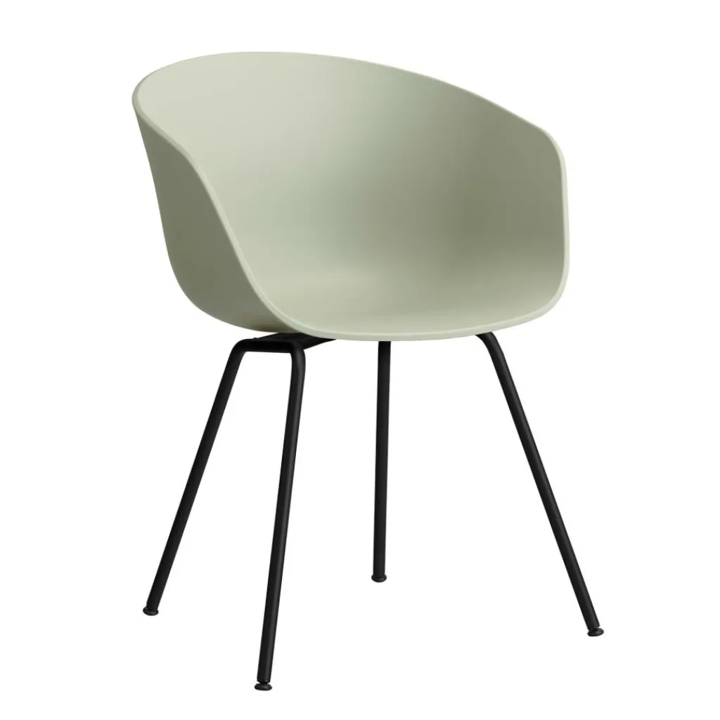 Wie ein Kokon umgibt einen die Sitzschale des About a Chair AAC 26 2.0 Armlehnstuhls Gestell schwarz. Die abgerundete Rückenlehne geht nahtlos in die beiden etwas niedrigeren Armlehnen über. Die Sitzfläche ist mit einer komfortablen Sitzmulde gearbeitet. Die Schale besteht aus recyceltem und durchgefärbtem Polypropylen, sodass verschiedene Farben zur Auswahl stehen. Das Vierfußgestell besteht aus zwei umgekehrt U-förmigen Beinpaaren mit bodenschützenden Filzgleitern an den Füßen und zwei stabilisierenden Mittelstreben, die gleichzeitig als Tragfläche für die Sitzschale fungieren. Es ist aus gebogenem Stahlrohr mit 18mm Durchmesser und pulverbeschichteter Oberfläche gearbeitet.