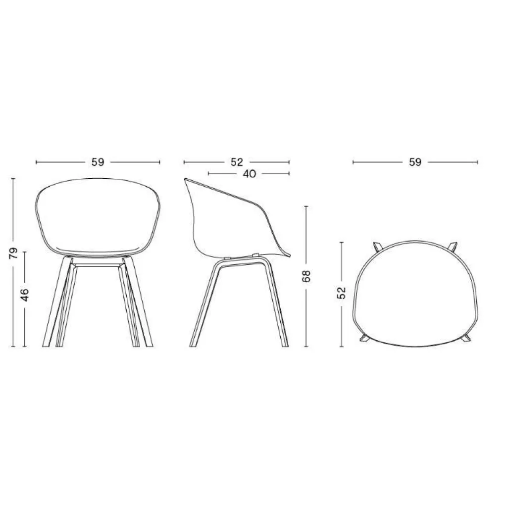 Die Höhe des nicht stapelbaren About a Chair 23 Armlehnstuhls beträgt 79 cm, die Sitzhöhe befindet sich auf 46 cm. Der 59 cm breiten und 52 cm tiefe Stuhl wird mit einem flauschigen Lammfell geliefert.