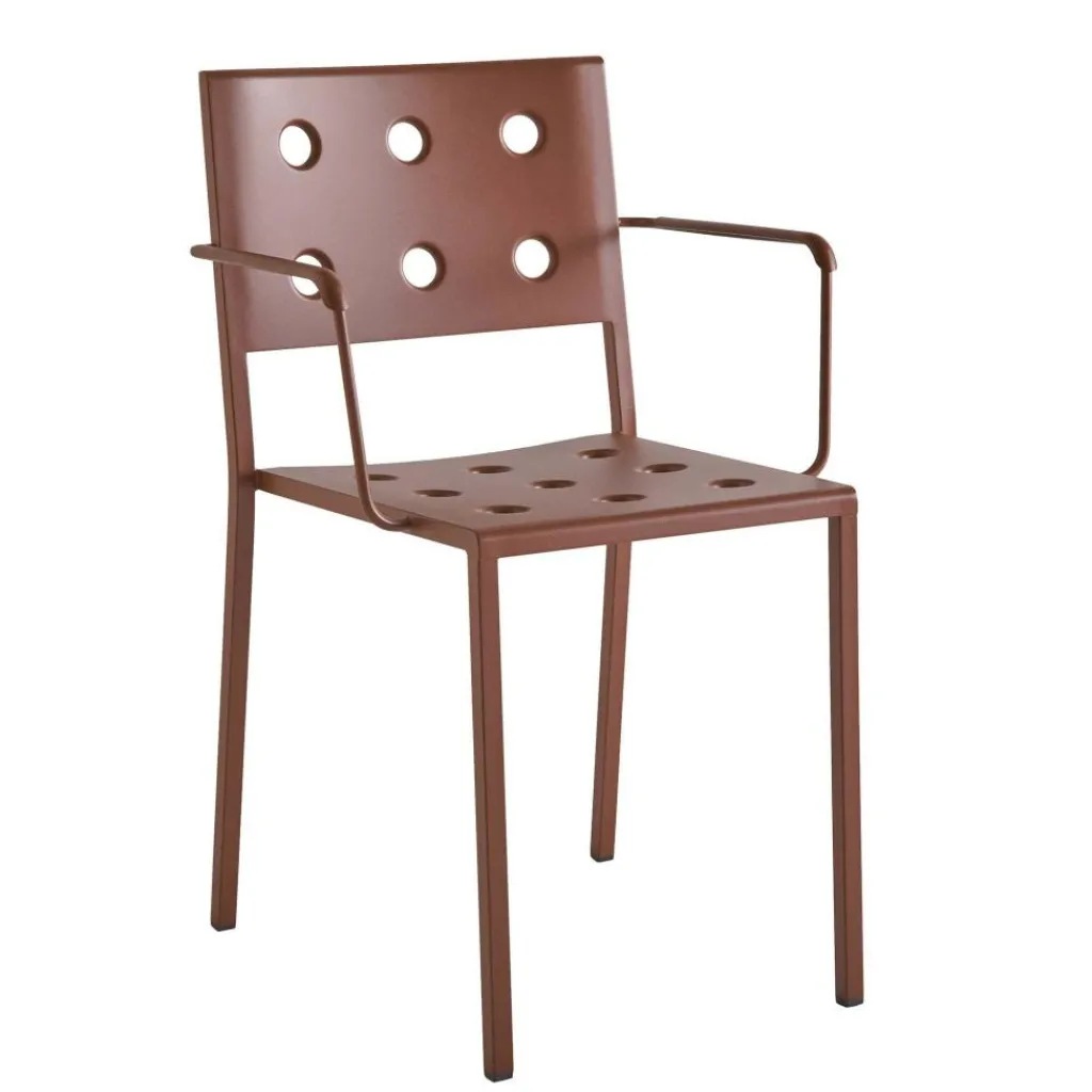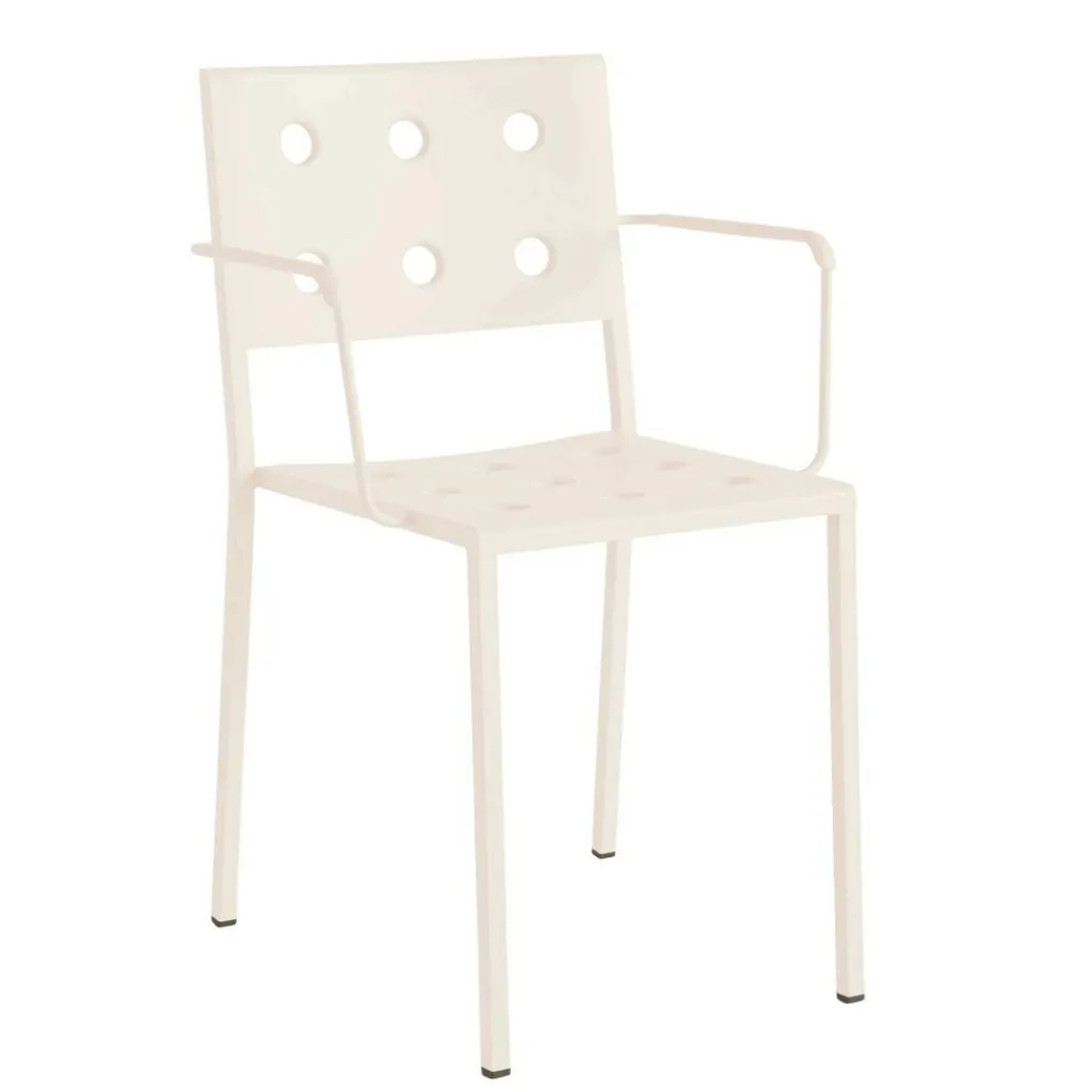 Der Balcony Dining Gartenarmlehnstuhl von HAY, entworfen von Ronan und Erwan Bouroullec, bringt grafische Klarheit und funktionale Raffinesse in den Außenbereich. Mit seiner markanten quadratischen Sitz- und Rückenfläche, die durch abgerundete Kanten und eine regelmäßige Lochstruktur optisch aufgelockert wird, verbindet der Stuhl architektonische Strenge mit subtiler Leichtigkeit.