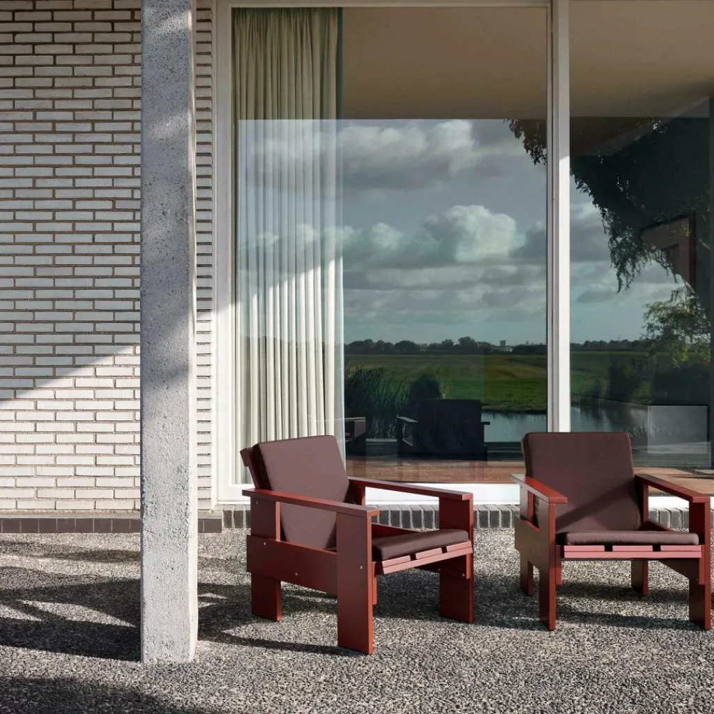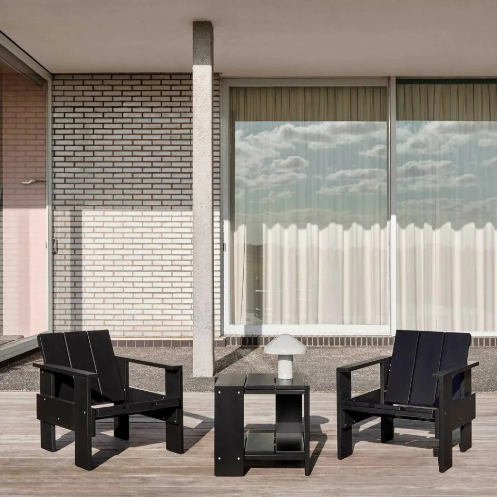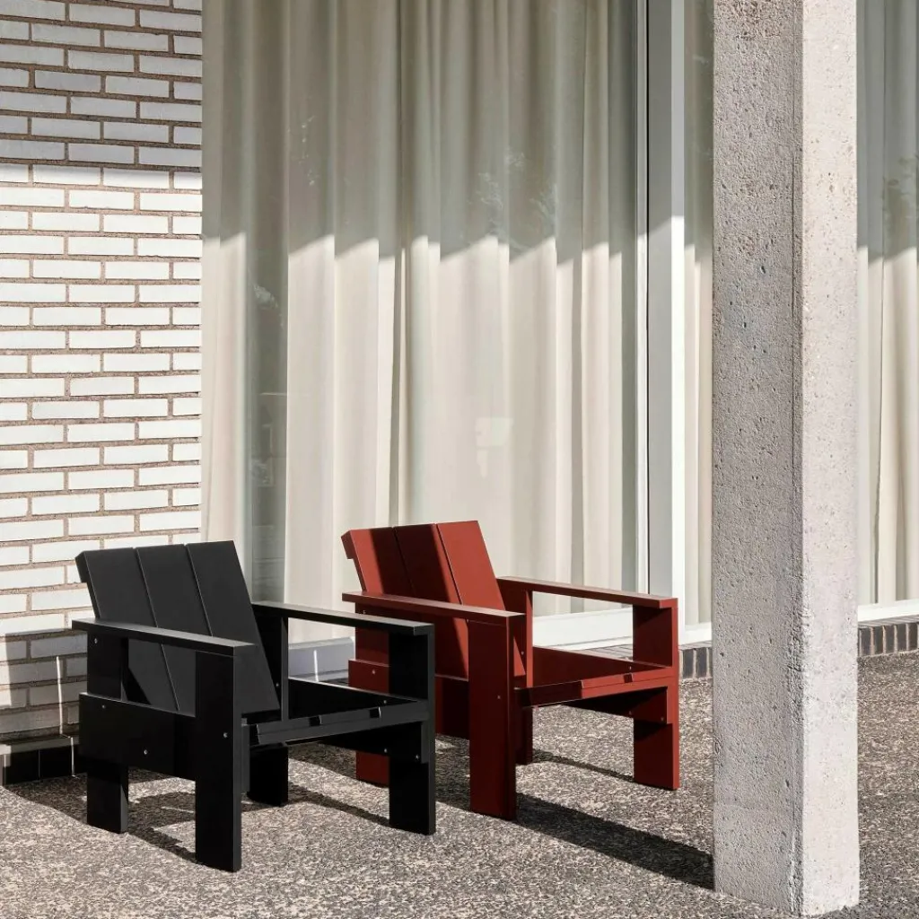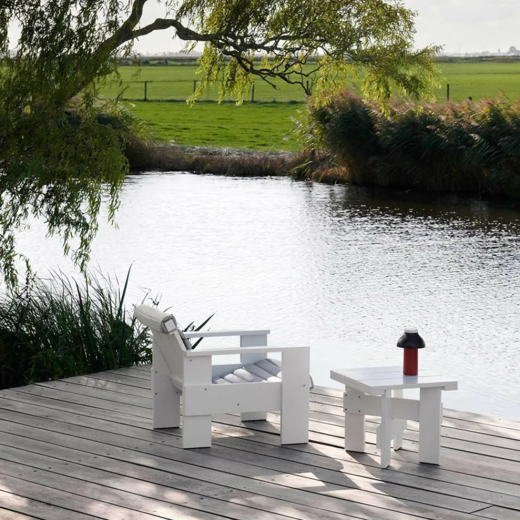 Der Crate Lounge Gartenstuhl 77cm wurde von Gerrit Rietveld für die Marke HAY entworfen. Er gehört zu einer Kollektion von Outdoormöbeln, die aus hölzernen Transportkisten bestehen. Das Design stammt aus 1934 und wurde nun unter Berücksichtigung der präzise abgestimmten Proportionen neu aufgelegt.