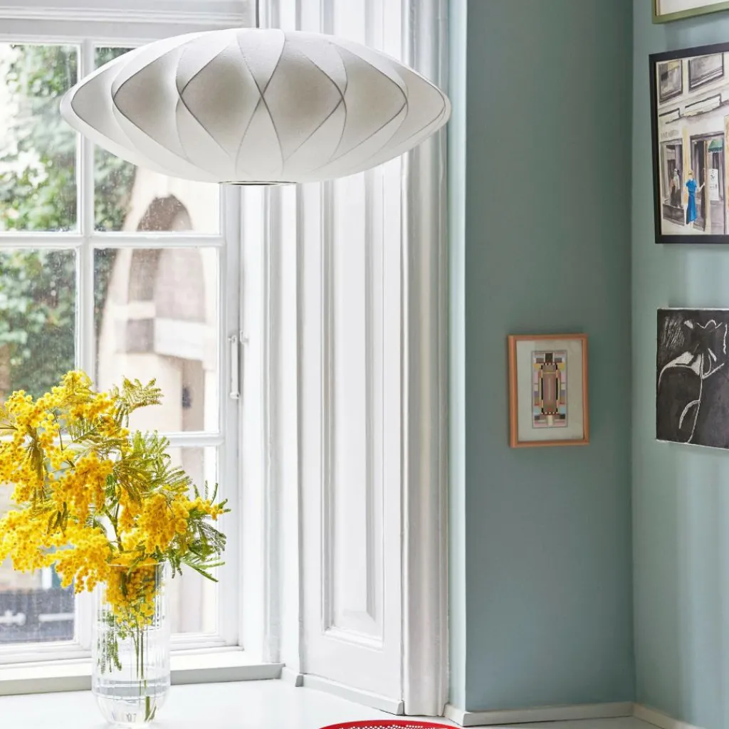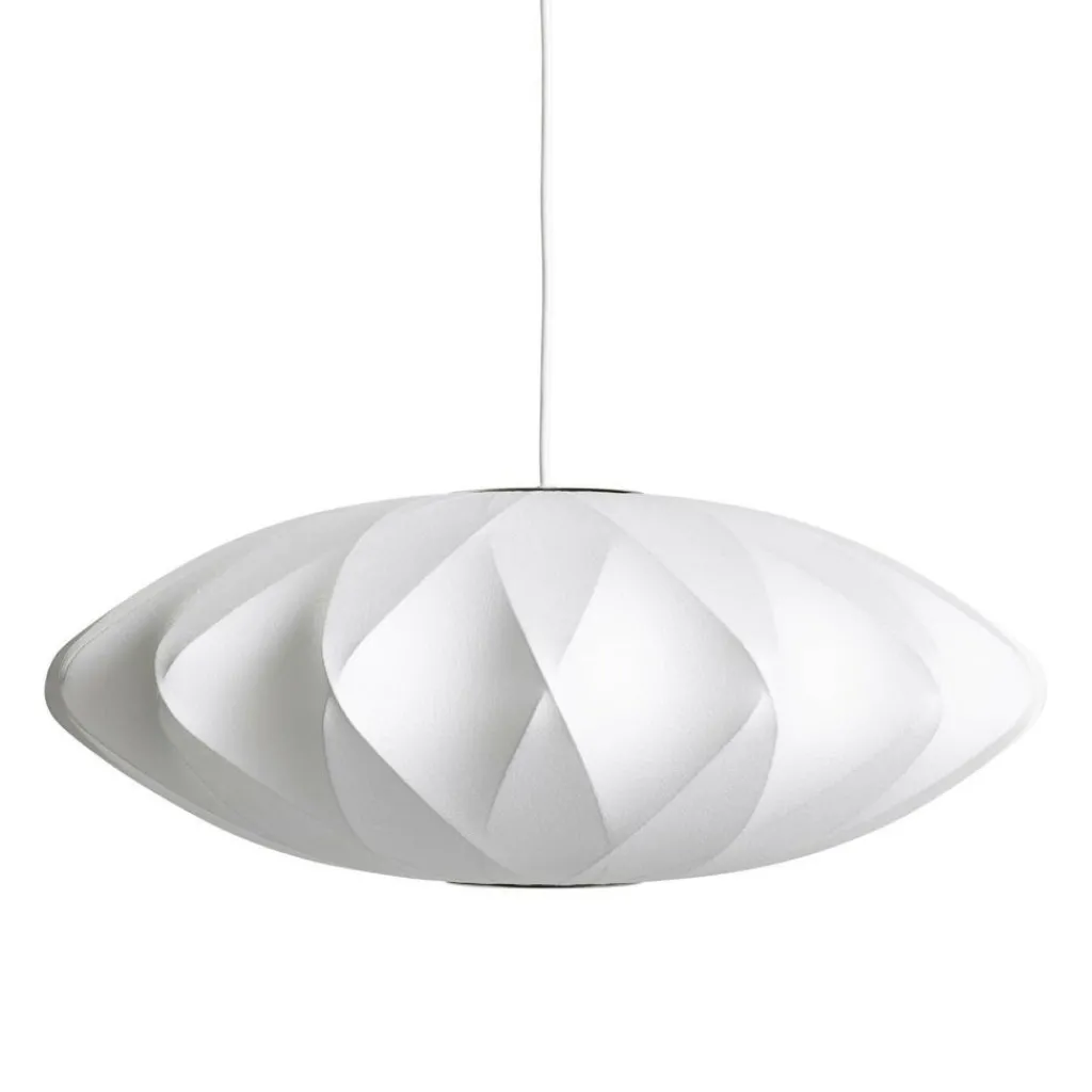 Die Nelson Saucer Crisscross Bubble Pendelleuchte wurde von George Nelson für die Marke HAY entworfen. Die Idee für die Bubble-Serie, die 1952 auf den Markt kam, fand der amerikanische Designer in edlen Seidenleuchten aus Schweden. Da sie ihm für sein eigenes Zuhause zu teuer waren, entschied er sich selbst ähnliche Leuchten aus günstigerem Material zu entwerfen. Fündig wurde er bei der U.S. Army: Sie hüllte nicht gebrauchte Militärschiffe in Textilgewebe ein, das mit einem harzartigen Kunststoffspray haltbar gemacht wurde.