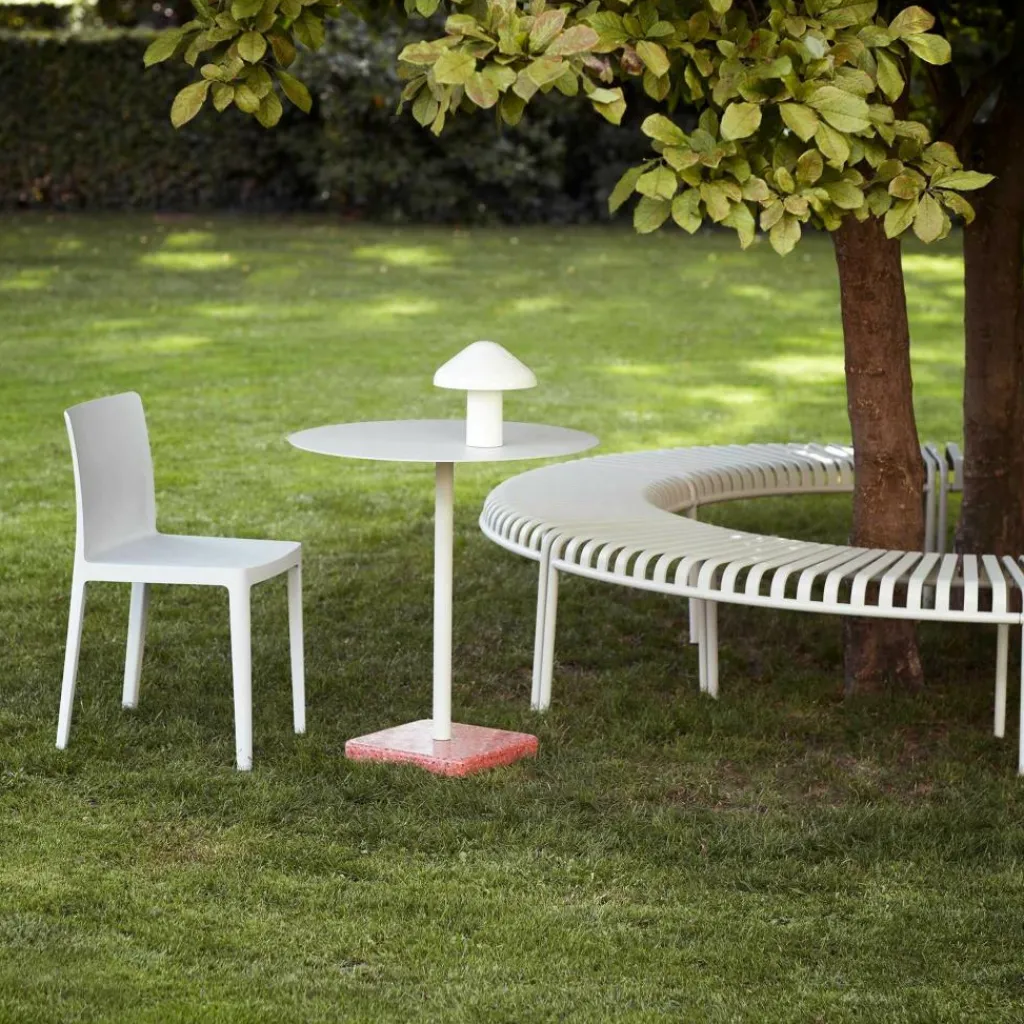 Die Pao Akkuleuchte wurde von Naoto Fukasawa für die Marke HAY entworfen. Mit der Bezeichnung spielt der japanische Designer auf die traditionellen mongolischen Pao-Zelte an, deren Form sich im Schirm der Outdoor-Designleuchte wiederfindet.