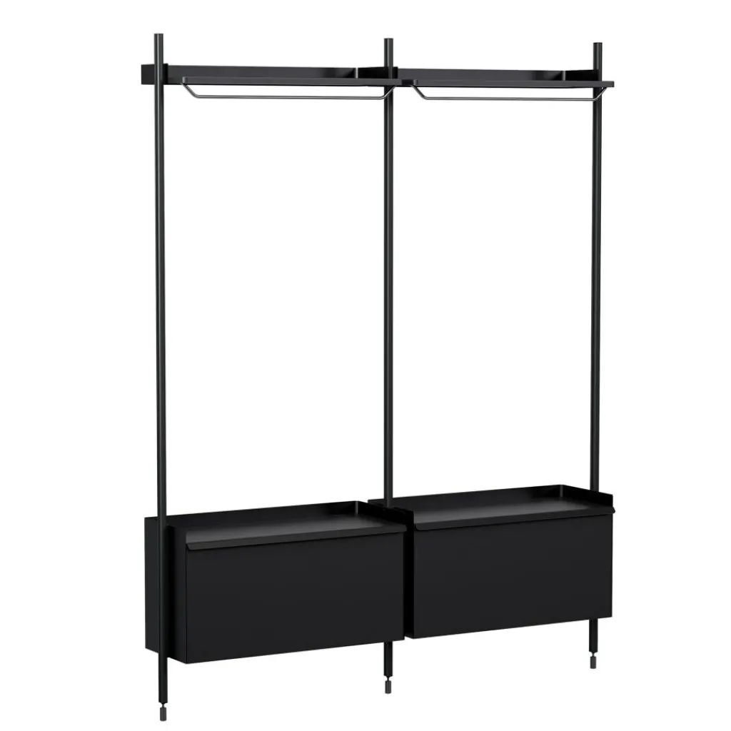 Moderne Möbel müssen robust und flexibel sein: Das wissen auch die Stardesigner aus Frankreich, die im Jahr 2022 die Pier-Kollektion vorstellten. Die Pier System 1002 Garderobe ist auf wesentliche Elemente reduziert: Drei filigrane Stahlrohre dienen als Gerüst und Füße. An ihren Enden sind Nivellierfüße montiert, die Bodenunebenheiten ausgleichen. Zwei Boxen bieten viel Stauraum. Sie werden mit Türen verschlossen, die mit einem Magneten ausgestattet sind. Jede der Boxen kann mit bis zu 15 kg belastet werden. So kann man in der Pier System 1002 Garderobe Schuhe und viele weitere Utensilien ordentlich verstauen. An der Oberseite ist der Rahmen mit einer Querstrebe verbunden. Darauf können Mäntel, Jacken und andere Kleidungsstücke aufbewahrt werden.