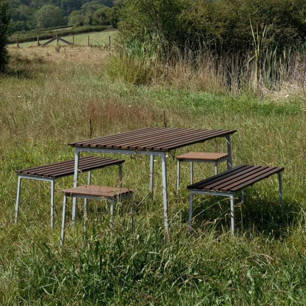 Mit seinen Maßen von 140 cm Länge, 83 cm Breite und 74 cm Höhe bietet der Tisch Platz für vier bis sechs Personen. Trotz seiner Stabilität bleibt er mit einem Gewicht von nur rund 22 kg angenehm mobil. Die Auslieferung erfolgt flach verpackt, die Montage ist schnell erledigt – lediglich die Beine müssen angeschraubt werden. Die Tischplatte besteht aus massivem Eschenholz, das in einem natürlichen Verfahren thermisch behandelt wurde – ganz ohne Chemikalien, allein mit Hitze und Dampf. Diese Technik verleiht dem Holz nicht nur eine tiefe, warme Farbgebung, sondern erhöht auch seine Widerstandsfähigkeit gegen Feuchtigkeit und Witterungseinflüsse. Mit der Zeit entwickelt das Holz durch Sonnenlicht eine silbergraue Patina, die dem Tisch einen lebendigen, sich wandelnden Charakter verleiht. Das Gestell aus Aluminiumguss ergänzt die massive Holzplatte mit einer technischen Eleganz. Die Aluminiumteile – zu einem großen Teil aus recyceltem Material gefertigt – sind kugelgestrahlt und mit einer schützenden, transparenten Lackierung versehen. Dieses Finish lässt die strukturierte Oberfläche sichtbar und betont so das industrielle Element des Designs. Querstreben aus extrudiertem Aluminium sorgen für zusätzliche Stabilität, ohne den leichten Gesamteindruck zu stören. Das verwendete Holz stammt aus verantwortungsvoller, FSC®-zertifizierter Forstwirtschaft. Kleine Risse oder Unregelmäßigkeiten im Holz sind natürliche Begleiterscheinungen, die weder die Funktion noch die Stabilität beeinträchtigen, sondern vielmehr den Charakter des Materials unterstreichen. Eine regelmäßige Pflege mit Holzöl hilft, die Oberfläche zu schützen und den ursprünglichen Farbton aufzufrischen.