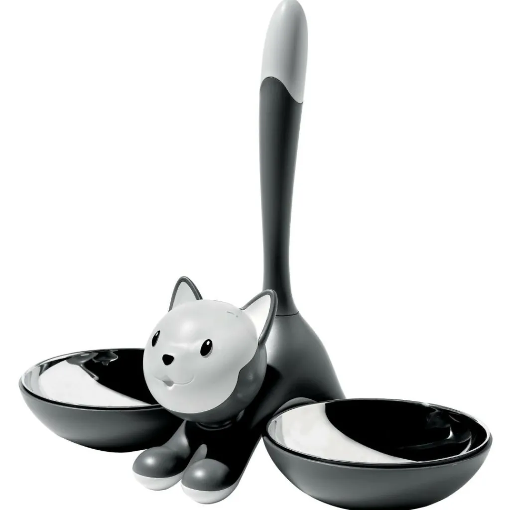 Die beiden Schalen können zur einfacheren Reinigung aus der Halterung entnommen werden. Sie bestehen aus Edelstahl, sind dadurch leicht zu reinigen und haben eine lange Lebensdauer. Der Körper der Katze und die Halterung für die Näpfe sind aus Kunststoff und damit pflegeleicht. Der Tigrito Katzennapf von Alessi ist in den Farben Gelb, Blau, Schwarz und Grau erhältlich. Er eignet sich hervorragend als Ergänzung zu anderen Produkten der tierischen Serie, erfreut aber als Geschenk auch jeden Katzenbesitzer.