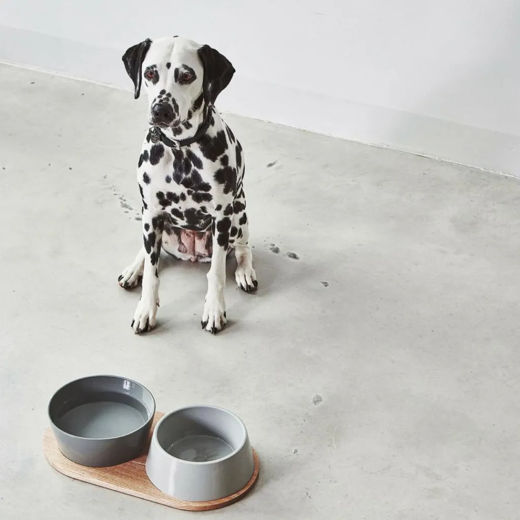 Doppio Hundenapf 2er Set mit Holztablett SM. Dieses Produkt ist von Hans Thyge & Co für die Marke MiaCara entworfen worden.