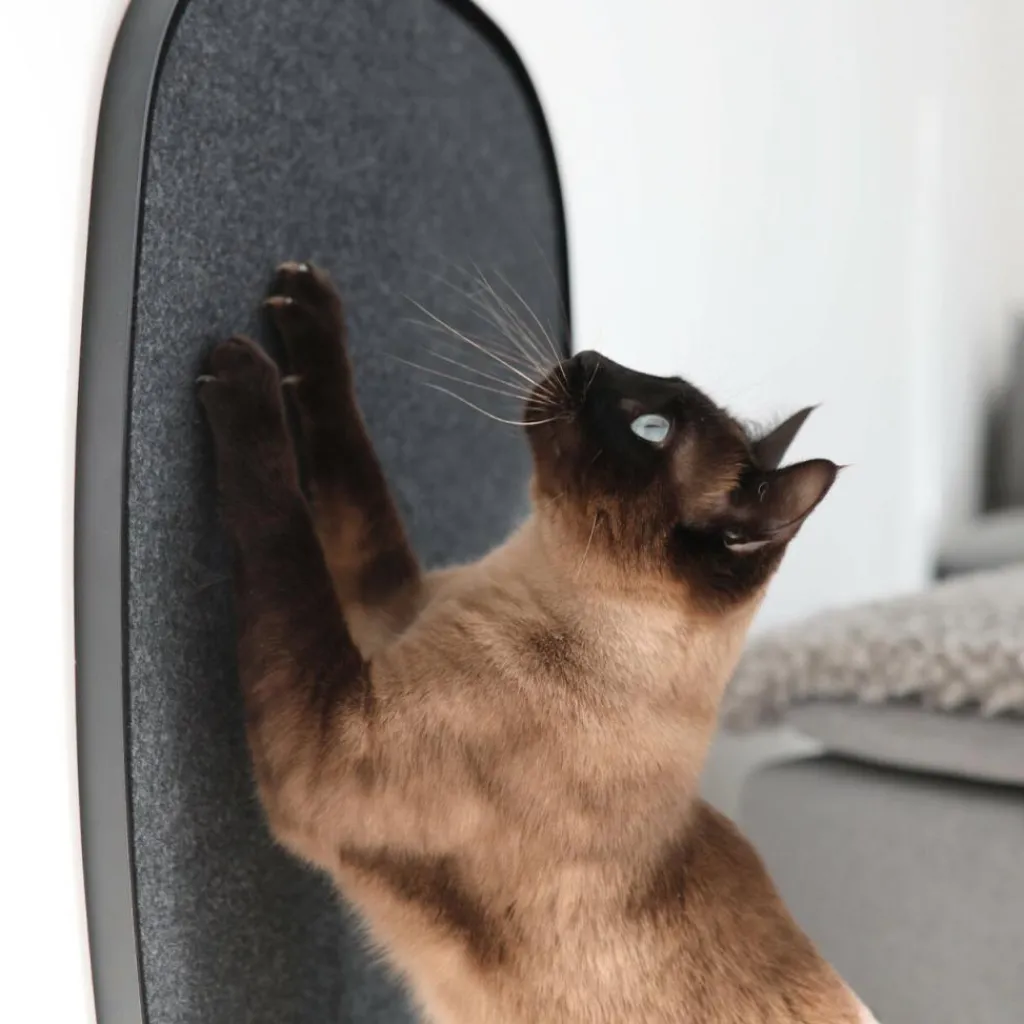 Das Pannello Kratzpaneel wird dem natürlichen Bedürfnis von Katzen gerecht, ihre Krallen durch Kratzen zu schärfen. Wer mit dem Pannello Kratzpaneel eine artgerechte Möglichkeit dazu bietet, schont Sofas und andere Möbel. Rasch bemerken die Tiere, wie gut es ihnen tut, sich am Pannello Kratzpaneel zu betätigen. Das rechteckige Modell mit runden Ecken macht nicht nur den Tieren Spaß, sondern sieht an der Wand montiert aus wie ein Designobjekt. Mithilfe der im Lieferumfang enthaltenen Fixierplatten lässt sich das Pannello Kratzpaneel sicher an der Wand montieren. Ein pulverbeschichteter Metallrahmen fasst das Paneel ein. Die Kratzfläche wird aus Formvlies gemacht. Es wird aus recyceltem PET hergestellt. Somit ist das Kratzpaneel eine nachhaltige Wahl.