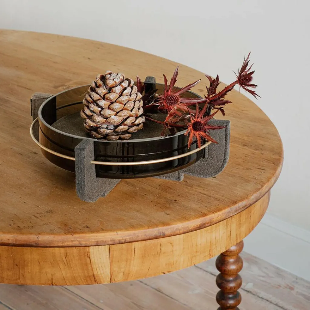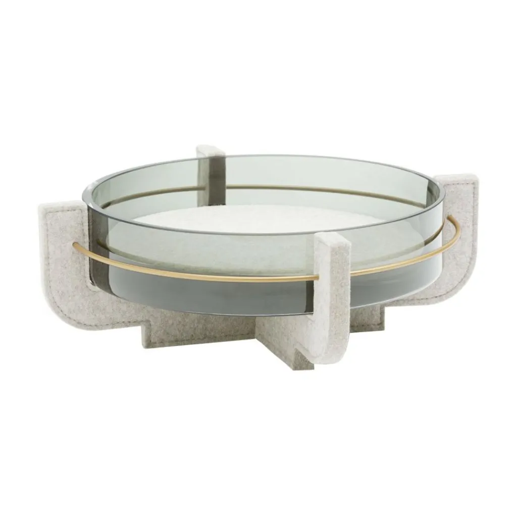 Ein kreuzförmig ausgeführtes Gestell aus Filz bildet den Fuß dieser attraktiven Designschale, die sich als Wasserschale für dekorative Gestecke, Blumen oder Kerzen eignet und auch mit frischem Obst gefüllt werden kann. Das Material besteht aus reiner Schurwolle. Für die Basis werden mehrere gleichartig zugeschnittene Filzscheiben übereinandergelegt, wodurch die Konstruktion einen breiteren Querschnitt bekommt und an Stabilität gewinnt. Die Verbindung der Filzscheiben erfolgt über eine zierliche Steppnaht. Ein Edelstahlring, der sich durch die vier oberen Enden der Basis zieht, schenkt ihr zusätzlichen Halt. Die darin eingesetzte Schale ist aus dunkel getöntem Rauchglas gefertigt und weist eine großzügige Wandstärke auf. Diese schenkt der Aurora Schale ein robustes Aussehen. Das Designobjekt bringt einen extravaganten Touch in jedes moderne Interieur. Es passt auf den Kaminsims, auf eine Anrichte oder das Fensterbrett: in einem schicken Hotel, einer Boutique oder im Wohnzimmer und eignet sich als Geschenk für einen besonderen Anlass.