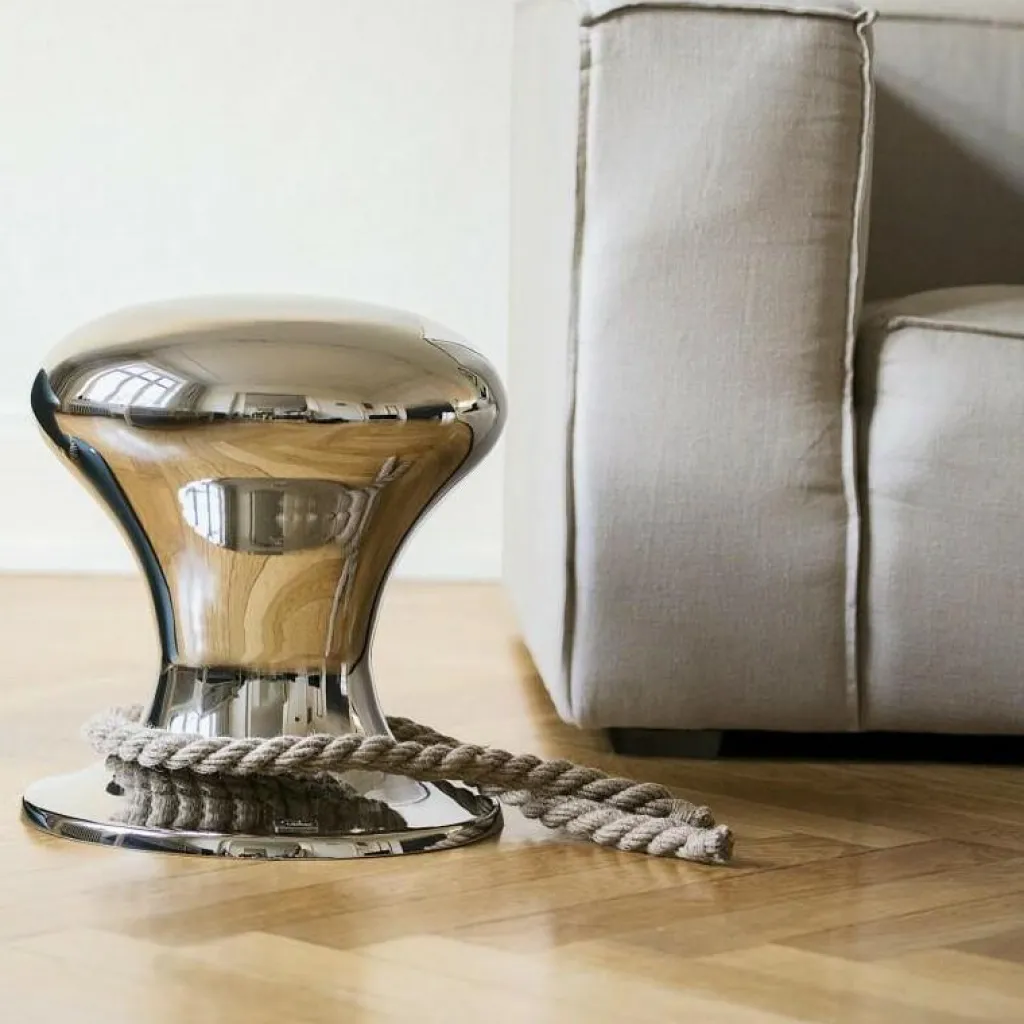 Die Form des Hockers erinnert an einen Poller, an dem die Schiffe mit einem Tau befestigt werden. Das Segeltau, das Ostwald unten an dem Hocker anbrachte, versinnbildlicht die Festmachung. Mit seinem Entwurf möchte der Designer Ankunft, Aufbruch und das Bleiben symbolisch in jedes Heim, in Hotels oder Cafés bringen – immer in Anlehnung an die Hansestadt. So verbreitet der Hamburger Hocker mit Segeltau maritimes Flair in jedem Raum.