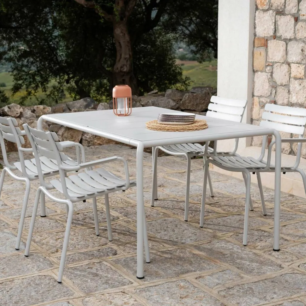Der Alua Gartenarmlehnstuhl beeindruckt durch seine klare, elegante Form und die Verwendung von hochwertigem Aluminium, das für seine Langlebigkeit und pflegeleichte Handhabung bekannt ist. Der Stuhl ist in verschiedenen Farben erhältlich, sodass er sich optimal an das Design Ihres Außenbereichs anpasst. Die sanft geschwungene Rückenlehne und Sitzfläche sorgen für eine angenehme und komfortable Sitzposition, während die Armlehnen zusätzlich für mehr Entspannung und Komfort sorgen. Das Gestell des Stuhls greift die eleganten Linien perfekt auf und verleiht ihm eine moderne Optik. Dank des stapelbaren Designs können bis zu zehn Stühle übereinandergestapelt werden, was den Alua Gartenarmlehnstuhl besonders praktisch für die Lagerung macht – ideal für private oder kommerzielle Nutzung. Die robuste Konstruktion sorgt dafür, dass der Stuhl auch bei wechselnden Witterungsbedingungen für viele Jahre im Außenbereich eingesetzt werden kann. Mit einer Breite von 63 cm, einer Tiefe von 59 cm und einer Höhe von 82 cm bietet der Alua Gartenarmlehnstuhl eine komfortable Sitzhöhe von 46,5 cm und wiegt nur 5,51 kg – somit ist er leicht zu bewegen und zu verstauen.