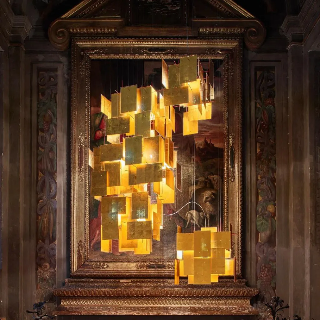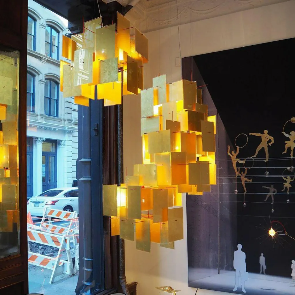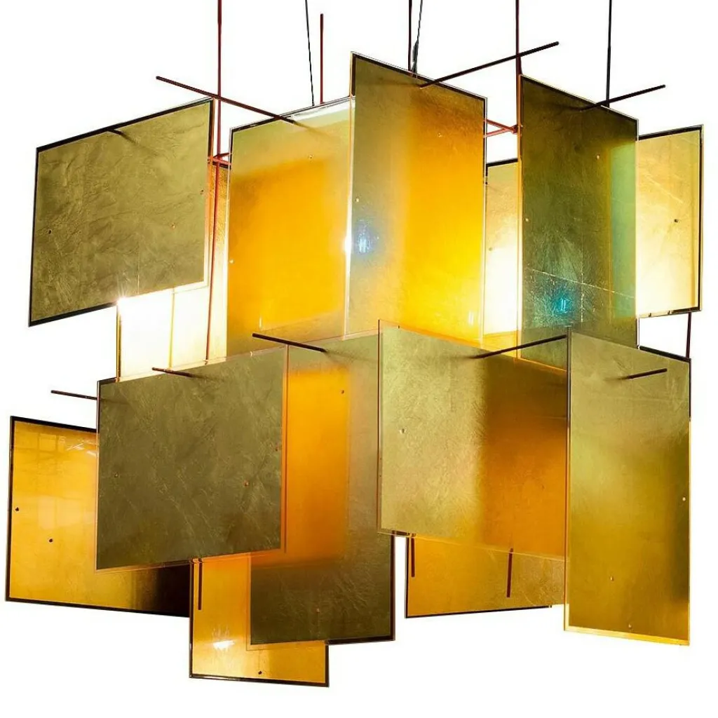 Kunstvoll und artistisch – die Leuchtobjekte des Designlabels Ingo Maurer stehen für modernes Design, das stets einen Wow-Effekt mitbringt. So wirkt auch die 1000 Karat Blau Pendelleuchte eher wie ein Kunstobjekt als eine normale Leuchte. Dem Designer Axel Schmid war es ein Anliegen, mit der Leuchte nicht nur die eigene Kreativität auszudrücken, sondern eben auch andere zu inspirieren: So sind die einzelnen vier Blenden aus mit in Acrylglas eingegossenem Blattgold gefertigt. Die Blenden haben Bohrungen, womit Sie diese an der Stangenkonstruktion hochkant und waagerecht anbringen können. Die 1000 Karat Blau Pendelleuchte mit einer Länge von 64cm, einer Breite von 60cm und einer Höhe von 50cm taucht den Raum in angenehm warmes Licht, da die handgefertigten Blenden besonders dünn sind. Trifft das Licht der LEDs auf das dünne Blattgold der Blenden, lässt dieses das kurzwellige blaue Licht durch. Das goldgelbe Licht wird hingegen reflektiert. So entsteht eine einzigartige Lichtatmosphäre, bei der die Blenden von außen betrachtet blau erscheinen, von innen jedoch golden. Die in Handarbeit gefertigte Pendelleuchte wird ohne Leuchtmittel geliefert. Ein passendes E27-Leuchtmittel kann unter Zubehör mitbestellt werden.