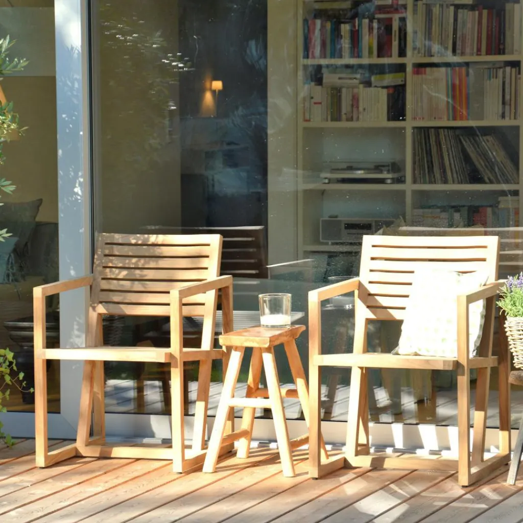Für den stilvollen Outdoorstuhl verwendet Hofbauer Teakholz. Der Werkstoff hat von Natur aus einen hohen Ölgehalt. Das macht ihn unempfindlich gegenüber Witterungseinflüssen. Der Timber Gartenarmlehnsessel kann auch bei schlechtem Wetter im Freien bleiben. Da die Sitzfläche und die Rückenlehne aus Lamellen zusammengesetzt sind, kann Regenwasser leicht durch die Spalten dazwischen abfließen. Auffallend ist die geneigte Rückenlehne. Sie bietet dem Körper in jeder Position eine wertvolle Stütze. Von der Seite gesehen, dienen zwei rechteckige Seitenrahmen als Füße und Armlehnen. Wegen seines zurückhaltenden Designs passt der Timber Gartenarmlehnsessel in jedes Umfeld. Er kann neben dem Pool, auf der Terrasse oder auf dem Balkon aufgestellt werden.
