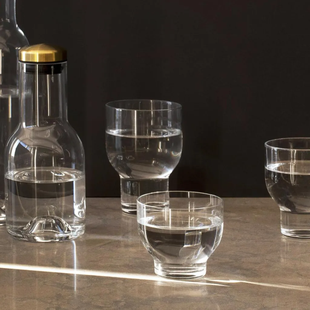 Die Bottle Karaffe mit Deckel wurde exklusiv von dem Designstudio Norm Architects für den Hersteller Audo entworfen. Dieser Entwurf ist Teil einer Serie, die mit alltäglichen Objekten spielt und diese in einen neuen Kontext setzt. Die Karaffe wurde von den typischen Weinbrand-Flaschen inspiriert, die über eine charakteristische Unterseite verfügen. Die traditionsreiche Form stellt damit eine Verbeugung vor der Vergangenheit dar, die in der Karaffe spannend in die Neuzeit transferiert wird.