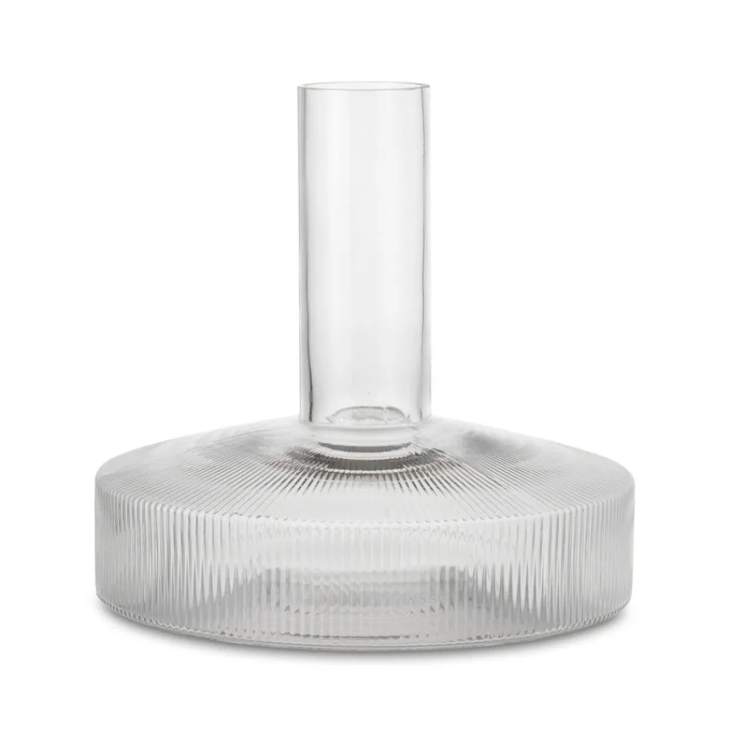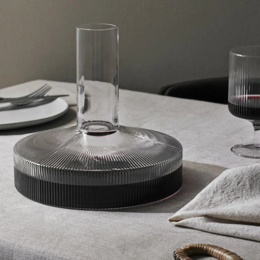 Die Ripple Wein Karaffe wurde für die Marke Ferm Living entworfen. Sie gehört einer klassischen Serie von formschönen Glaswaren an, die ihren Namen von einer zarten Oberflächen-Riffelung ableiten. Die Ripple-Modelle sind im Stil der 1920er-Jahre kreiert und beeindrucken mit einer zarten Eleganz. In präziser Handarbeit gefertigt, stellen sie hochwertige Einzelstücke dar.