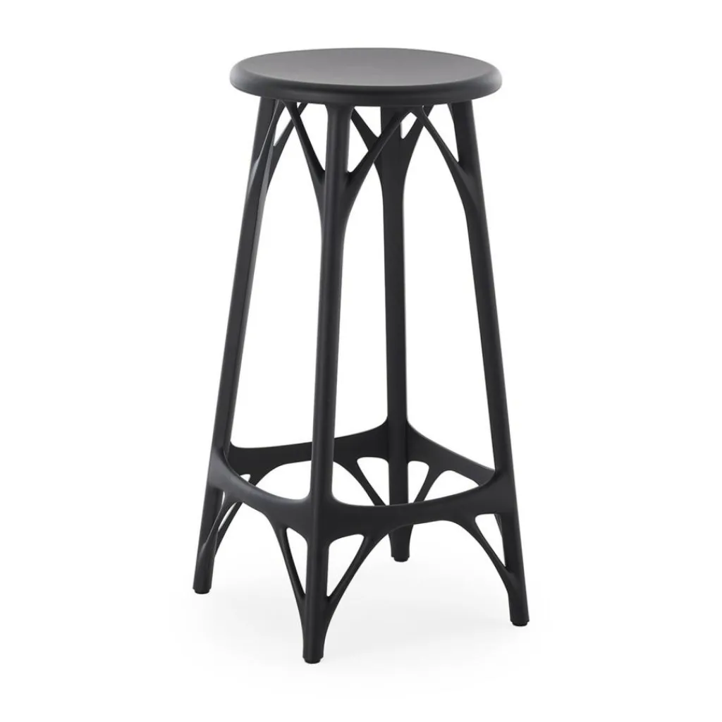 Die Fragestellung an das innovative Computerprogramm, das den Prototypen in 3D entwarf, war einfach: Es sollte einen Stuhl erschaffen, der mit wenig Materialeinsatz und Energie produziert werden kann. Mit einem Algorithmus wurde er diesem Anspruch gerecht. In dem Projekt musste Starck zwischendurch Weichen stellen, darum ist der AI Light Barhocker 65cm eine Verschmelzung künstlicher mit menschlicher Intelligenz. Herausgekommen ist ein ansprechender Hocker: Die leicht ausgestellten Beine sind oben und unten mit schmalen Querstreben verbunden, die an Äste erinnern. Beim AI Light Barhocker 65cm handelt es sich um ein nachhaltig erzeugtes Möbelstück: Es besteht aus thermoplastischem Technopolymer. Das Material wird aus Plastikabfall gemacht.