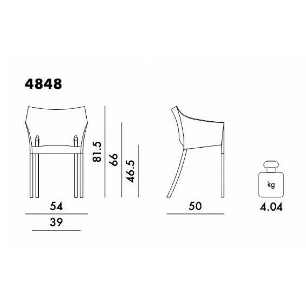 Wird der 4 kg schwere Dr. No Armlehnstuhl nicht gebraucht, können mehrere Exemplare platzsparend übereinandergestapelt werden. Der Stuhl ist 54 cm breit und 81,5 cm hoch. Die Tiefe beträgt 50 cm und die Sitzhöhe 46,5 cm. Besonders gut passt der Stuhl zum Tisch aus derselben Kollektion.