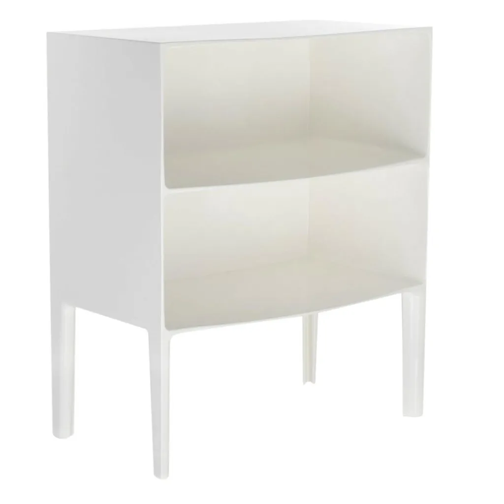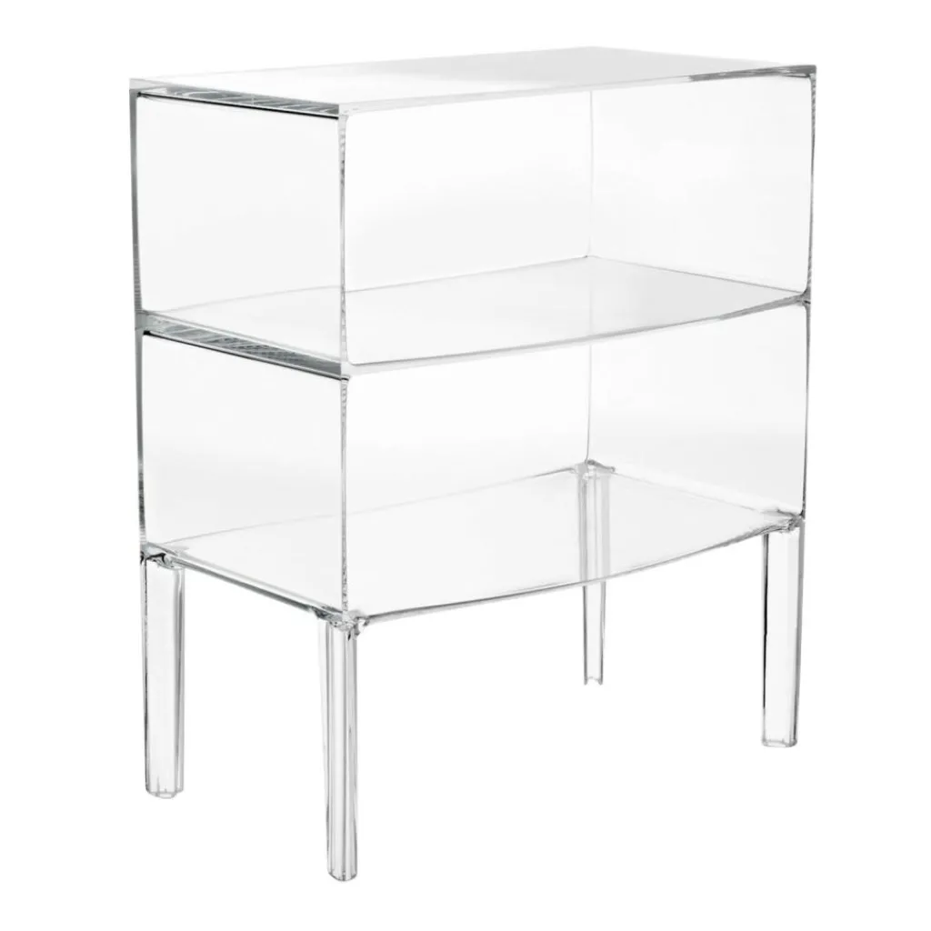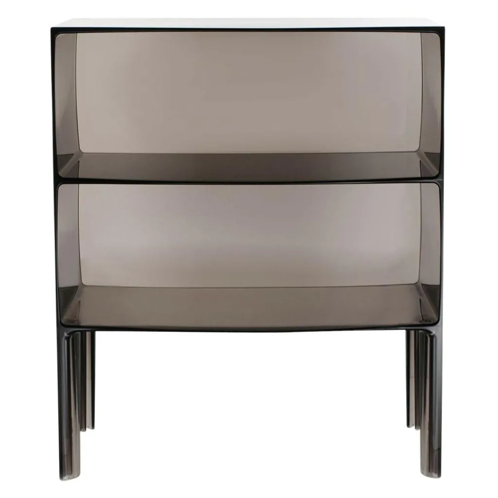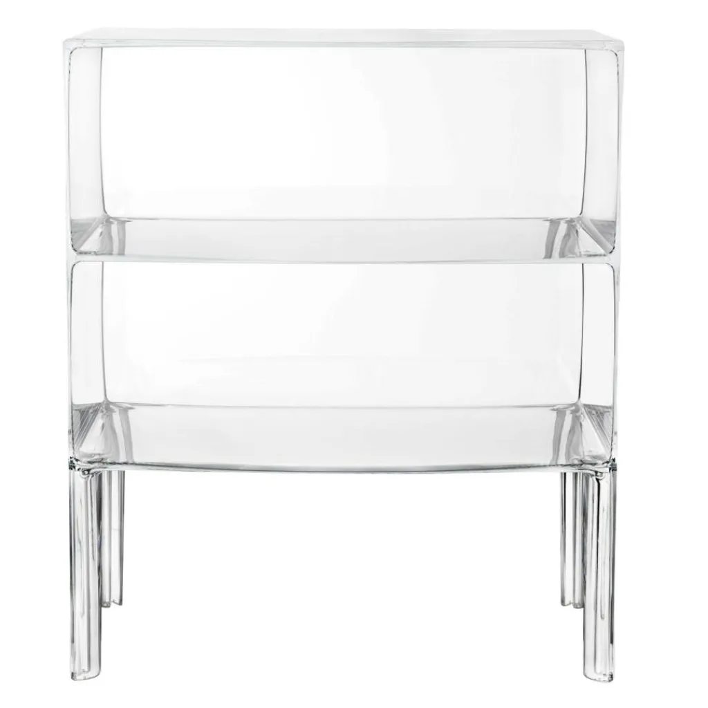 Mit ihren zwei übereinander gestapelten Fächern auf vier abgerundeten Beinen erinnert die Form der Ghost Buster Kommode an ein klassisches Möbelstück. Revolutionär ist ihr Material: Polycarbonat. Es ist besonders leicht und je nach gewählter Ausführung mehr oder weniger durchsichtig. Die Ghost Buster Kommode passt damit hervorragend vor eine Fensterwand. Sie ist wasserresistent und eignet sich auch als Badezimmermöbel oder für den Outdoorbereich. Ein spektakulärer Hingucker ist sie als Bücherablage im Wohnzimmer oder als Podest für Pflanzen im Wintergarten. Da die Ghost Buster Kommode aus einem Stück gegossen ist, ist sie zudem auch besonders stabil.