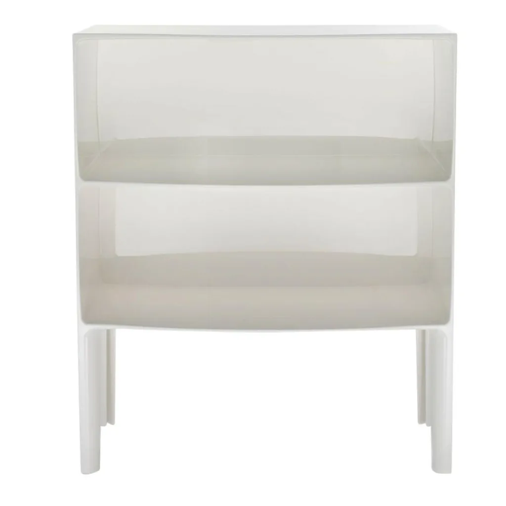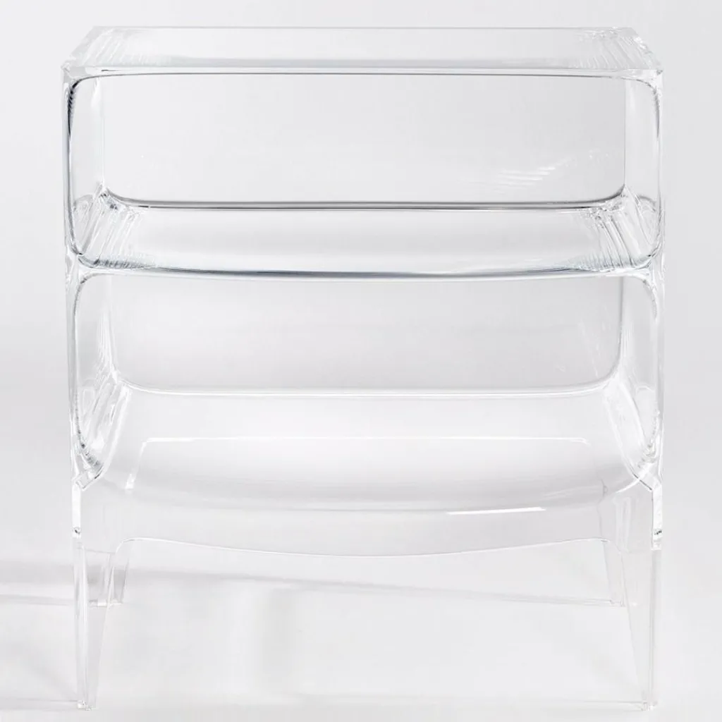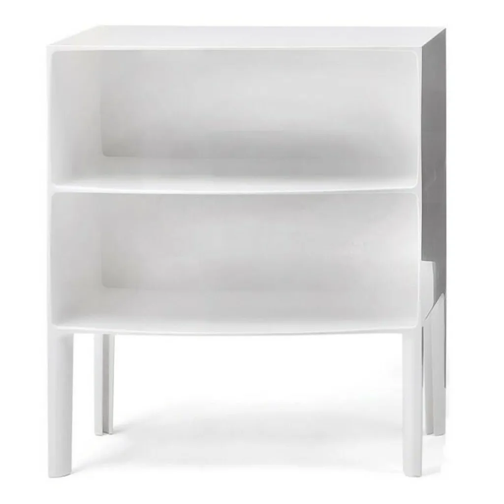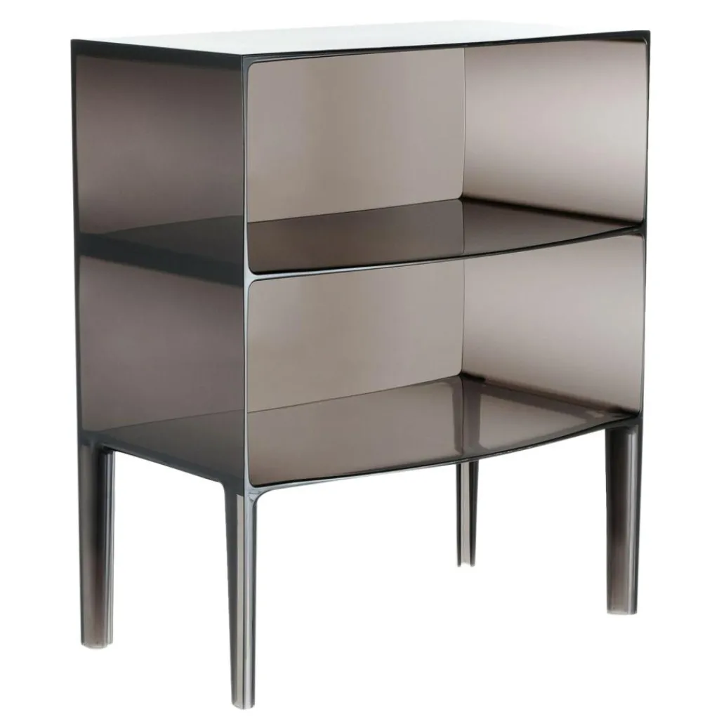 Mit ihren zwei übereinander gestapelten Fächern auf vier abgerundeten Beinen erinnert die Form der Ghost Buster Kommode an ein klassisches Möbelstück. Revolutionär ist ihr Material: Polycarbonat. Es ist besonders leicht und je nach gewählter Ausführung mehr oder weniger durchsichtig. Die Ghost Buster Kommode passt damit hervorragend vor eine Fensterwand. Sie ist wasserresistent und eignet sich auch als Badezimmermöbel oder für den Outdoorbereich. Ein spektakulärer Hingucker ist sie als Bücherablage im Wohnzimmer oder als Podest für Pflanzen im Wintergarten. Da die Ghost Buster Kommode aus einem Stück gegossen ist, ist sie zudem auch besonders stabil.
