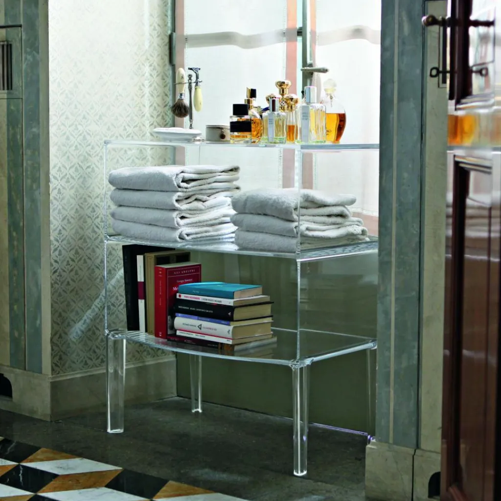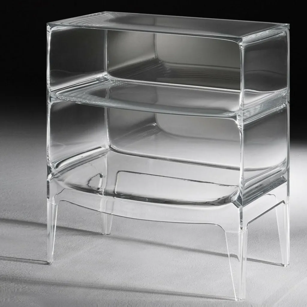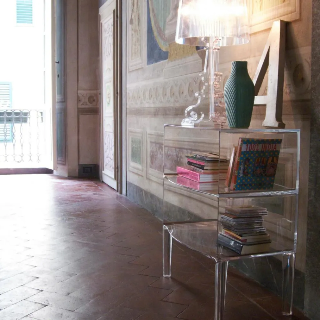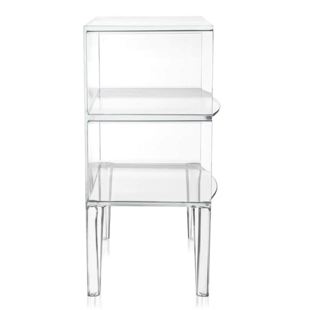Mit ihren zwei übereinander gestapelten Fächern auf vier abgerundeten Beinen erinnert die Form der Ghost Buster Kommode an ein klassisches Möbelstück. Revolutionär ist ihr Material: Polycarbonat. Es ist besonders leicht und je nach gewählter Ausführung mehr oder weniger durchsichtig. Die Ghost Buster Kommode passt damit hervorragend vor eine Fensterwand. Sie ist wasserresistent und eignet sich auch als Badezimmermöbel oder für den Outdoorbereich. Ein spektakulärer Hingucker ist sie als Bücherablage im Wohnzimmer oder als Podest für Pflanzen im Wintergarten. Da die Ghost Buster Kommode aus einem Stück gegossen ist, ist sie zudem auch besonders stabil.