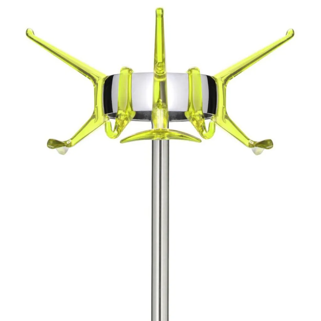 Schon alleine das Material macht den Hanger Kleiderständer zum optischen Blickfang. Meda entschied sich nämlich für poliertes Aluminium für das Gestell. Einen interessanten Kontrast zu dem glänzenden Material bilden die sechs an der Oberseite des Kleiderständers befestigten Haken. Sie sind in verschiedenen Farben erhältlich. So schafft man sich einen interessanten Farbtupfer in den Flur oder die Garderobe. Sicheren Stand gewährleistet dem Hanger Kleiderständer ein runder Fuß. In seinem Mittelpunkt entspringt ein dünnes Stahlrohr. Im unteren Drittel ist ein Ring befestigt, der als Schirmständer fungiert. Am Ende der Stange ist ein breiter Ring befestigt, der wiederum die Kleiderhaken trägt. Mindestens sechs Mäntel oder Jacken finden auf dem Kleiderständer Platz.