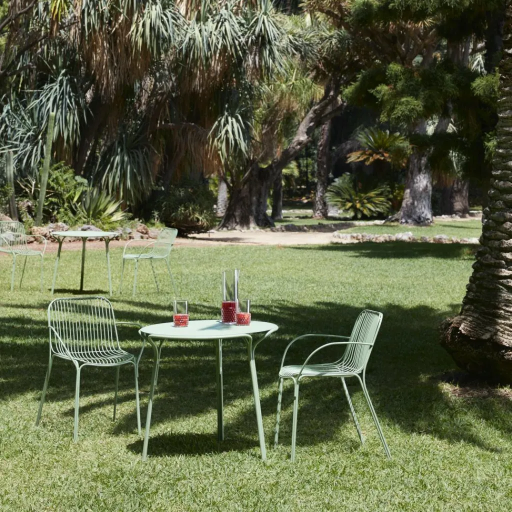 Mit seinem schlichten Erscheinungsbild passt der Hiray Gartenarmlehnstuhl in jedes Umfeld. Er bietet im privaten Garten oder am Balkon sowie in Lokalen und Hotels eine stilvolle Sitzgelegenheit. Der Hiray Gartenarmlehnstuhl wird aus lackiertem, verzinktem Stahl gemacht. Die Sitzfläche und Rückenlehne werden aus dünnem Stahldraht gebildet. Sie sind in einen Rahmen eingefasst, der abgerundete Ecken aufweist. Auch die filigranen Armlehnen sind elegant gerundet. Die vier Beine bilden je zwei Metallrohre – hier treffen die Rahmenteile zusammen. Verfügbar ist der Hiray Gartenarmlehnstuhl in verschiedenen Farben. Passend zum Hiray Gartenarmlehnstuhl sind Sitzkissen erhältlich. Sie sind aus recycelten Materialien hergestellt.