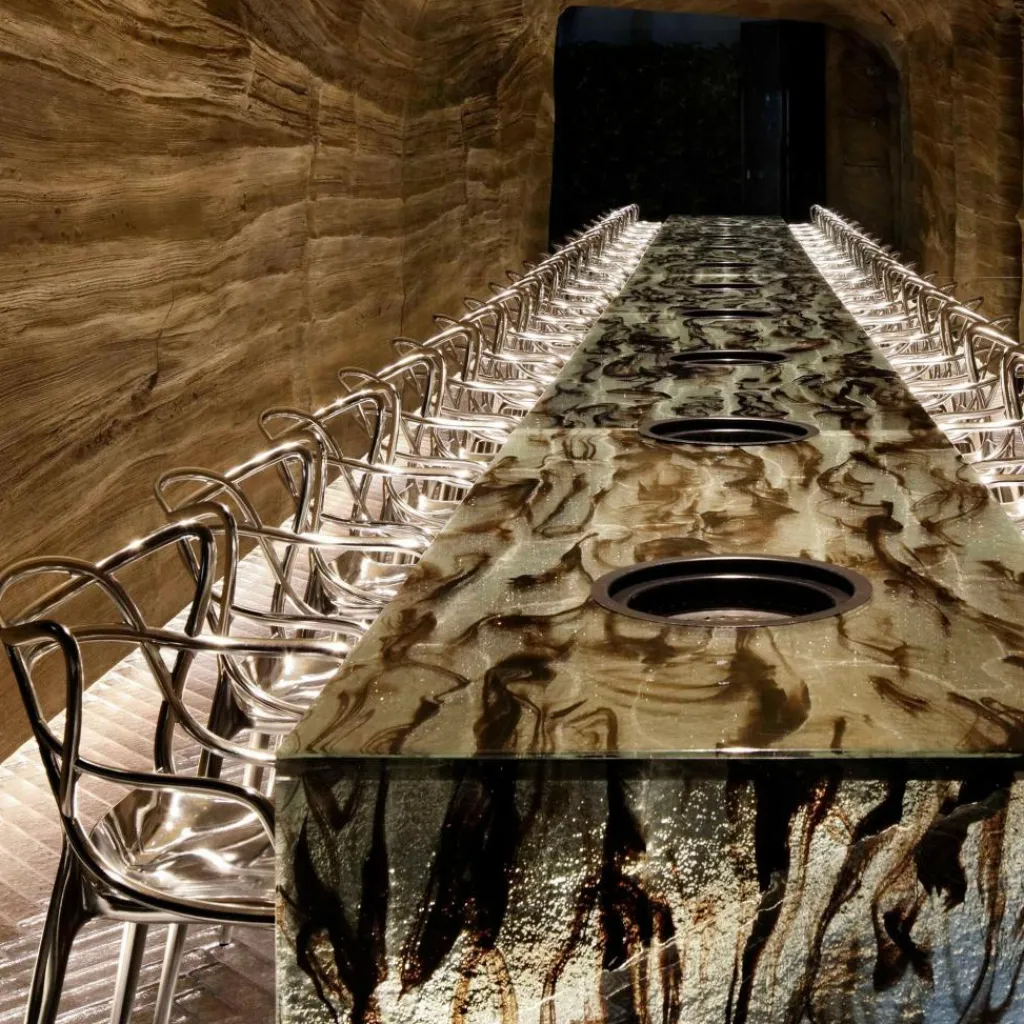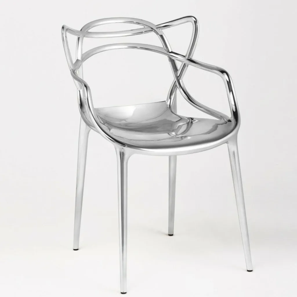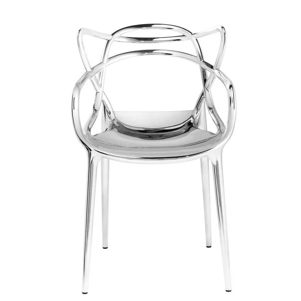 Der Masters Metallic Armlehnstuhl wurde von Philippe Starck für die Marke Kartell entworfen. Als Quelle der Inspiration dienten die ‚Serie 7‘ von Arne Jacobsen, der ‚Tulip Armchair‘ von Eero Saarinen und der ‚Eiffel Chair‘ von Charles Eames. Entstanden ist ein extravaganter Stuhl, der sich mit fließenden Formen auszeichnet.