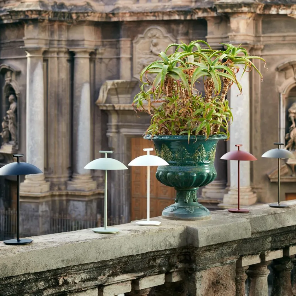 Dank ihrer schlanken Silhouette kann die Leuchte überallhin mitgenommen werden. Dabei ist der Griff behilflich, der oben am Leuchtenschirm befestigt ist. Am Leuchtenschirm befindet sich der Schalter. Damit kann man die Leuchte ein- und ausschalten sowie die Helligkeit dimmen. Beim erneuten Einschalten merkt sich die Mini Geen-A LED Outdoor Tischleuchte mit Akku die letzte Einstellung. Das Modell strahlt warmweißes Licht nach unten aus. Voll aufgeladen hält der Akku 7 h. Das integrierte Leuchtmittel hat eine Lebensdauer von 50.000 Betriebsstunden. Die Mini Geen-A LED Outdoor Tischleuchte mit Akku wird aus Stahl gemacht. Eine Pulverbeschichtung sorgt dafür, dass ihr Witterungseinflüsse nichts anhaben können. Das erkennt man auch daran, dass die Leuchte in Schutzart IP54 gemacht ist. Das in verschiedenen Farben erhältliche Modell wird mit einem USB-Kabel geliefert.